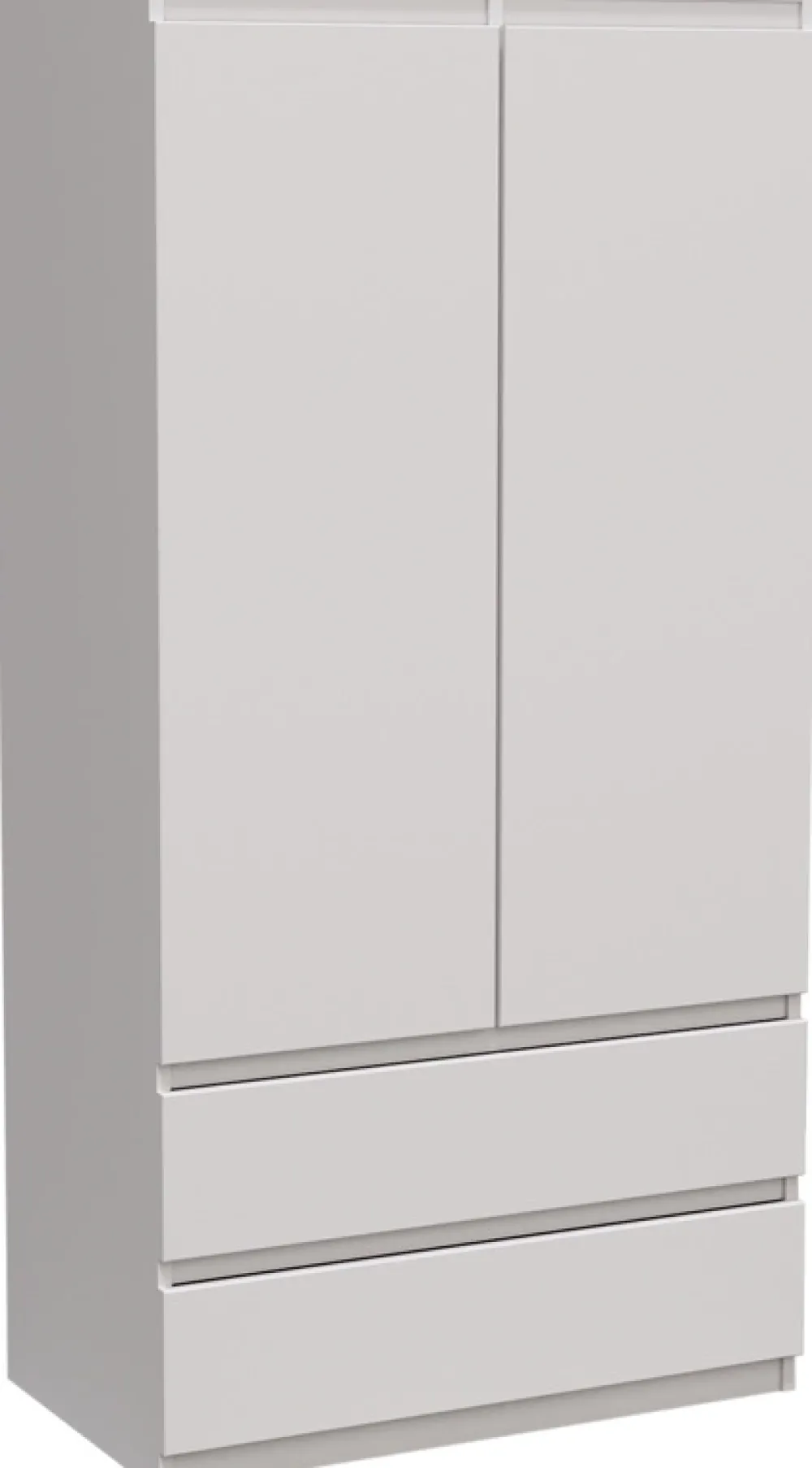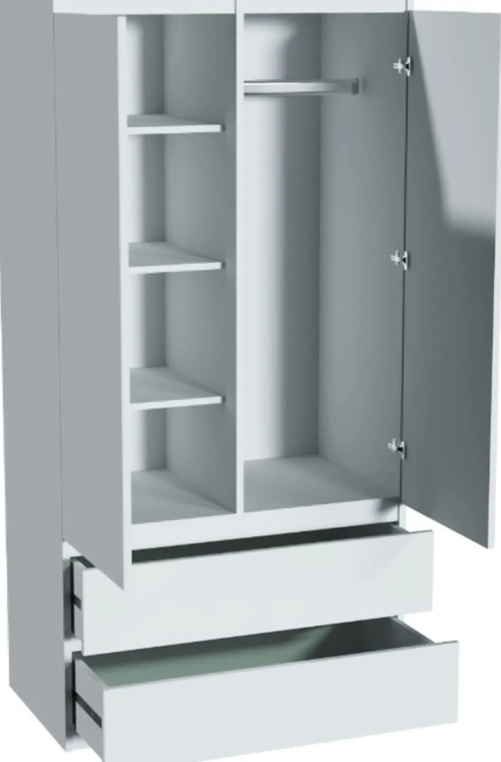 - Szafa wyposażona jest w dwie pojemne szuflady u dołu oraz dwudrzwiową część z drążkiem na wieszaki po lewej stronie i czterema półkami po prawej stronie, co zapewnia wygodne przechowywanie ubrań i akcesoriów.