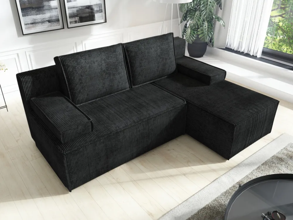 Narożnik tapicerowany jest tkaniną sztruksową, która wyróżnia się miękkością i charakterystyczną prążkowaną strukturą. Sztruks nie tylko dodaje narożnikowi elegancji, ale także jest wytrzymały i odporny na codzienne użytkowanie. Dzięki temu narożnik nie tylko świetnie wygląda, ale również zapewnia długotrwały komfort. Sztruksowa tapicerka wprowadza do wnętrza przytulność, która podkreśla nowoczesny charakter mebla.
