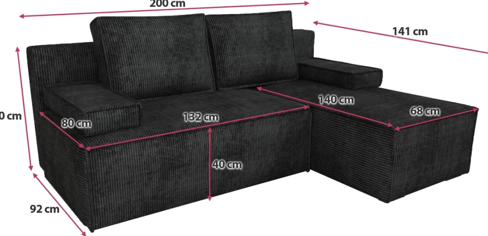 - Funkcja spania o powierzchni 138 × 200 cm pozwala na komfortowy sen dla gości lub relaksująca drzemkę w ciągu dnia. Narożnik rozkładany jest za pomocą sprężynowego automatu DL, który wspomaga unoszenie siedziska ku górze.