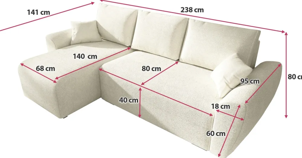 - Funkcja spania o powierzchni 138 × 200 cm pozwala na komfortowy sen dla gości lub relaksująca drzemkę w ciągu dnia. Narożnik rozkładany jest za pomocą sprężynowego automatu DL, który wspomaga unoszenie siedziska ku górze.