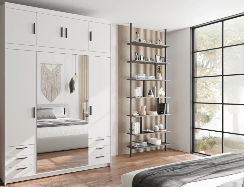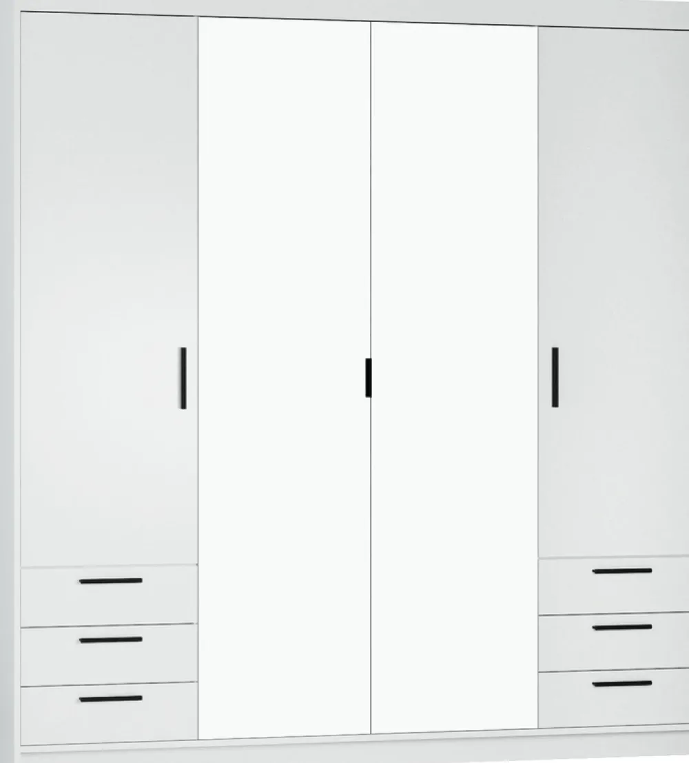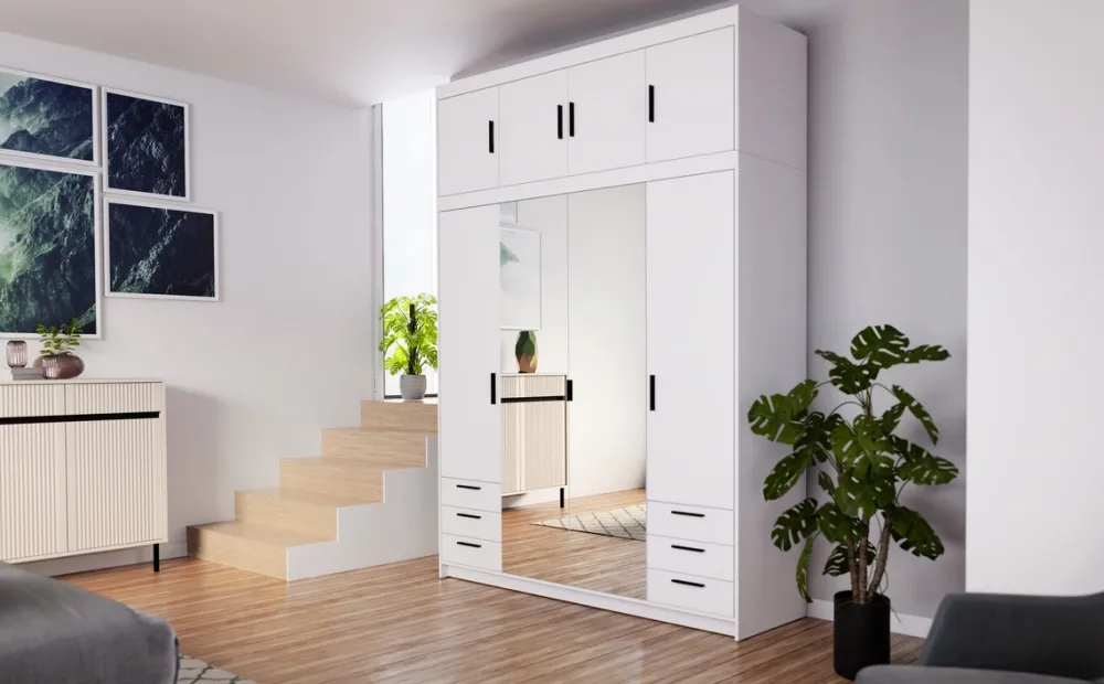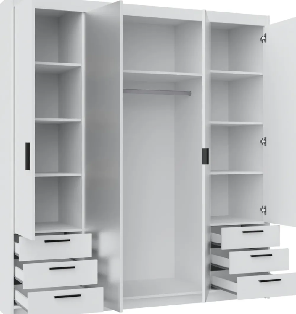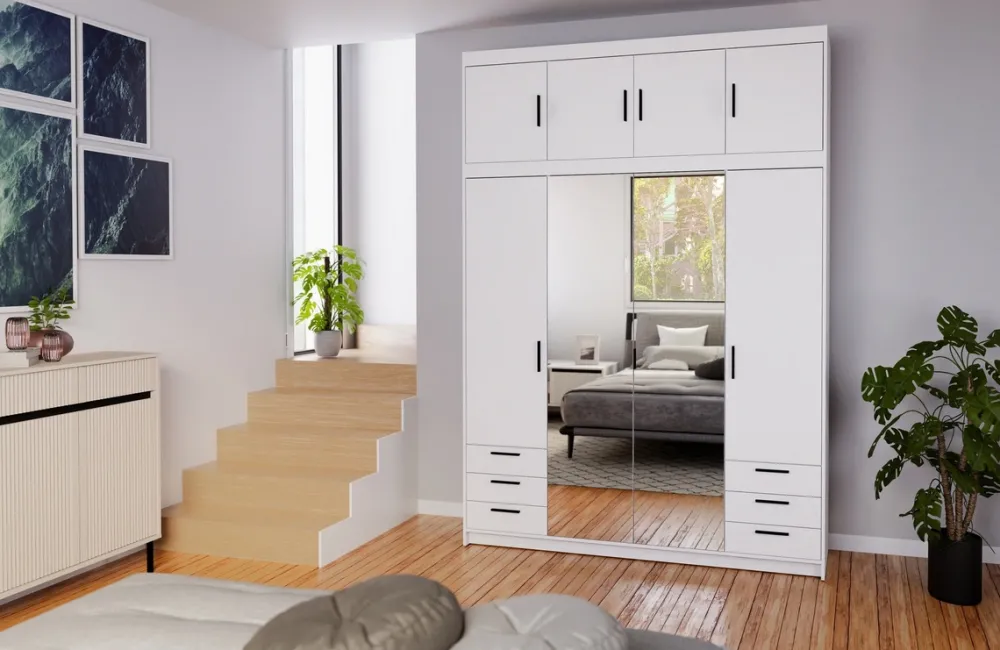 - Szafa KUBA 176 cm z lustrem i dopasowaną nadstawką to eleganckie połączenie funkcjonalności i stylu. 4 drzwi, 6 szuflad, 9 półek i drążek zapewniają przestronność, lustro optycznie powiększa wnętrze a biały kolor wprowadza nowoczesność do garderoby.