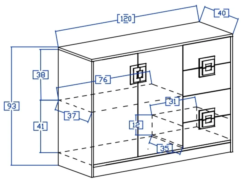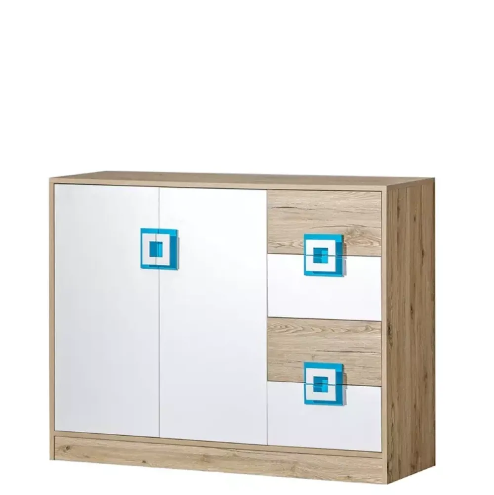 - Komoda o szerokości 120 cm z dziecięcej kolekcji NICO. Komoda posiada cztery szuflady po prawej stronie oraz parę drzwi, za którymi znajdują się dwa poziomy. Uchwyty w komodzie są dostępne w czterech wariantach kolorystycznych.
