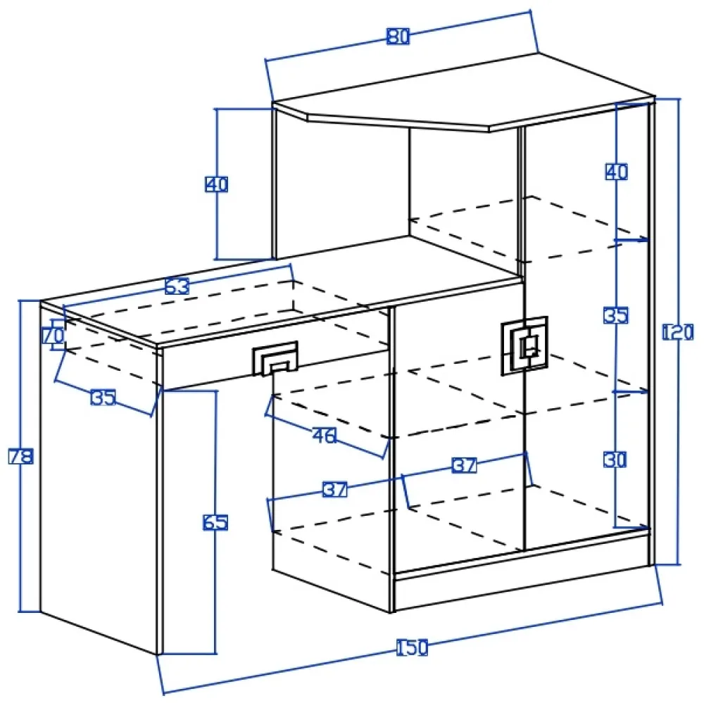 - Zestaw mebli dziecięcych z kolekcji NICO jest idealnym rozwiązaniem dla osób szukających kompletnych mebli do pokoju. Zestaw składa się z komody, szafy narożnej z szufladami, regału z trzema półkami oraz biurka z szafką.