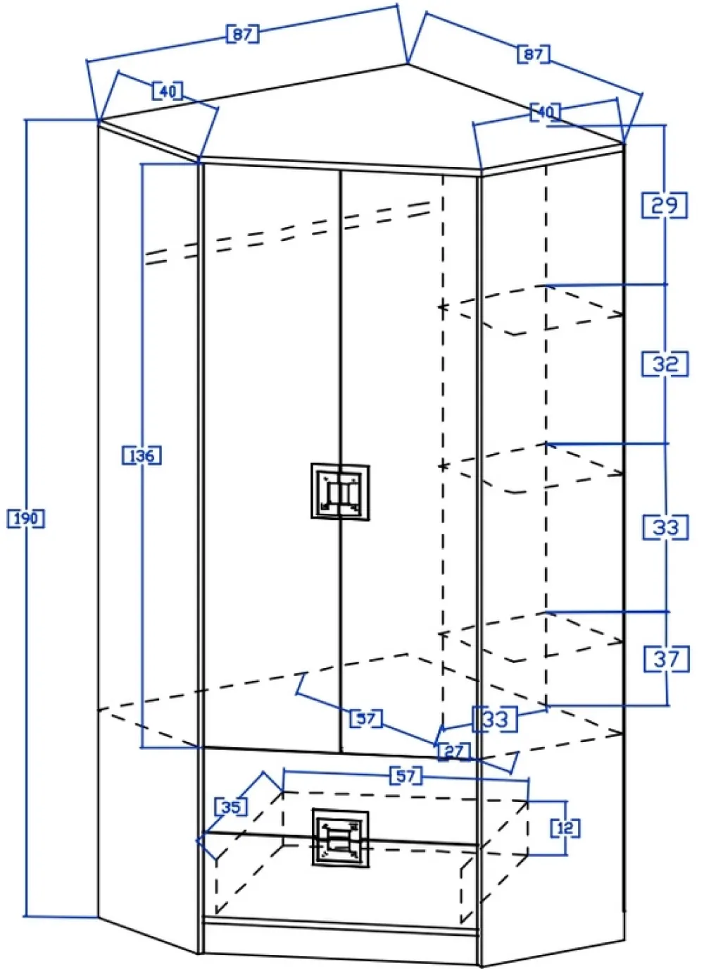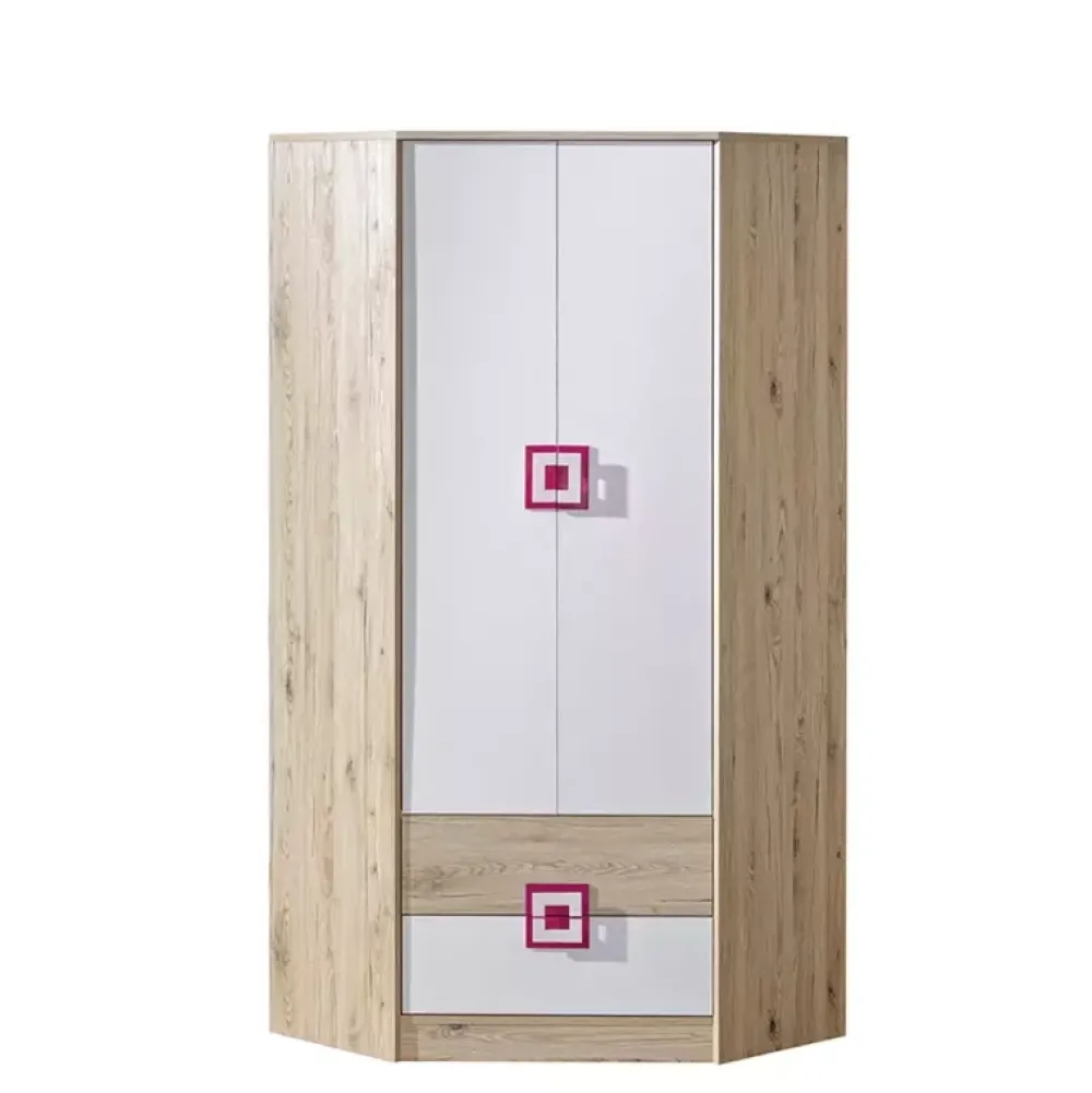 Kompletny zestaw mebli do pokoju dziecięcego z kolekcji NICO. W skład zestawu wchodzi komoda z dwiema szufladami oraz drzwiami, za którymi znajdziemy półkę. Szafa narożna z dwiema szufladami i drzwiami, za którymi kryją się trzy półki oraz drążek na wieszaki jest idealnym rozwiązaniem dla osób szukających praktycznych rozwiązań na zagospodarowanie rogów pomieszczenia. Regał z dwiema szufladami oraz czterema poziomami również znalazł miejsce w zestawie. Uzupełnieniem zestawu jest biurko, które zostało wyposażone w szufladę pod blatem oraz szafkę po prawej stronie z drzwiami, za którymi znajdziemy trzy półki.