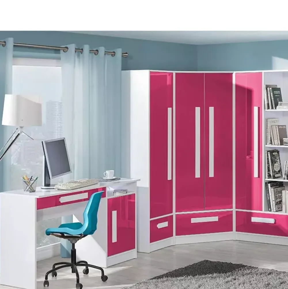 Zestaw nowoczesnych mebli systemowych z kolekcji GULIVER. Zestaw składa się z biurka z szufladą i szafką, w której znajduje się półka, Regału z trzema półkami, szafy narożnej z szufladą, trzema półkami i drążkiem z przestrzenią na wieszaki oraz regału z trzema otwartymi półkami, trzema zamkniętymi drzwiami oraz szufladą. Zestaw mebli dzięki wielu dostępnym opcjom kolorystycznym frontów i uchwytów doskonale spisuje się we współczesne aranżacje pokoju dziecka.