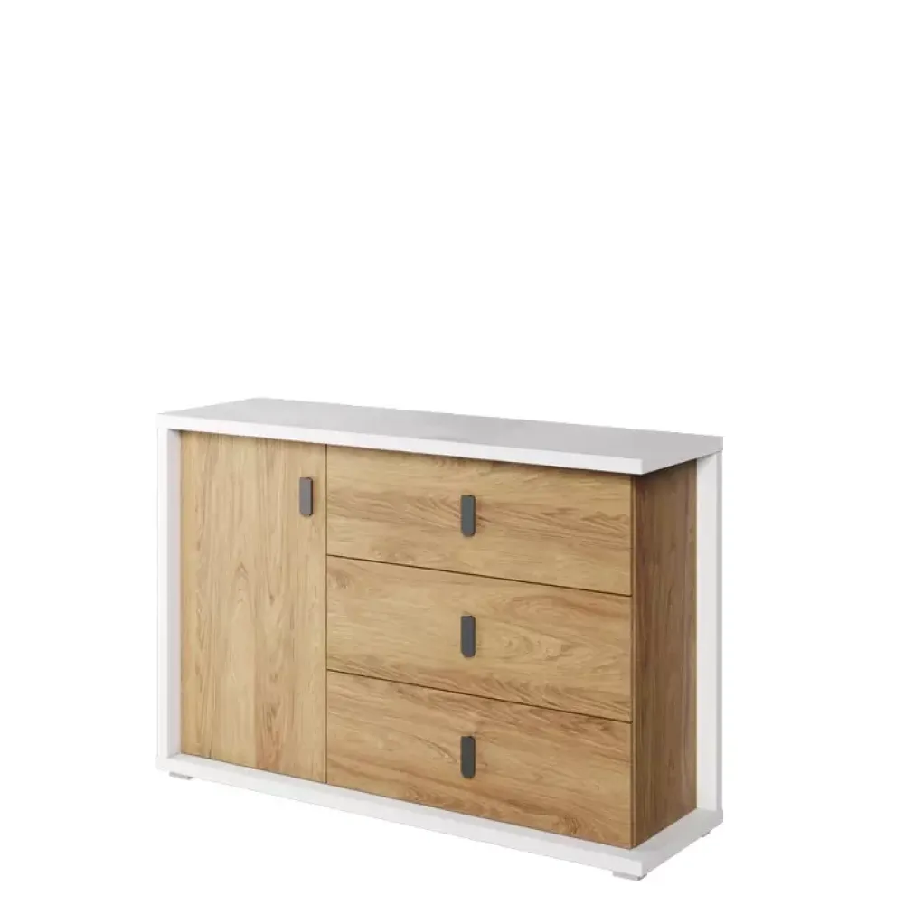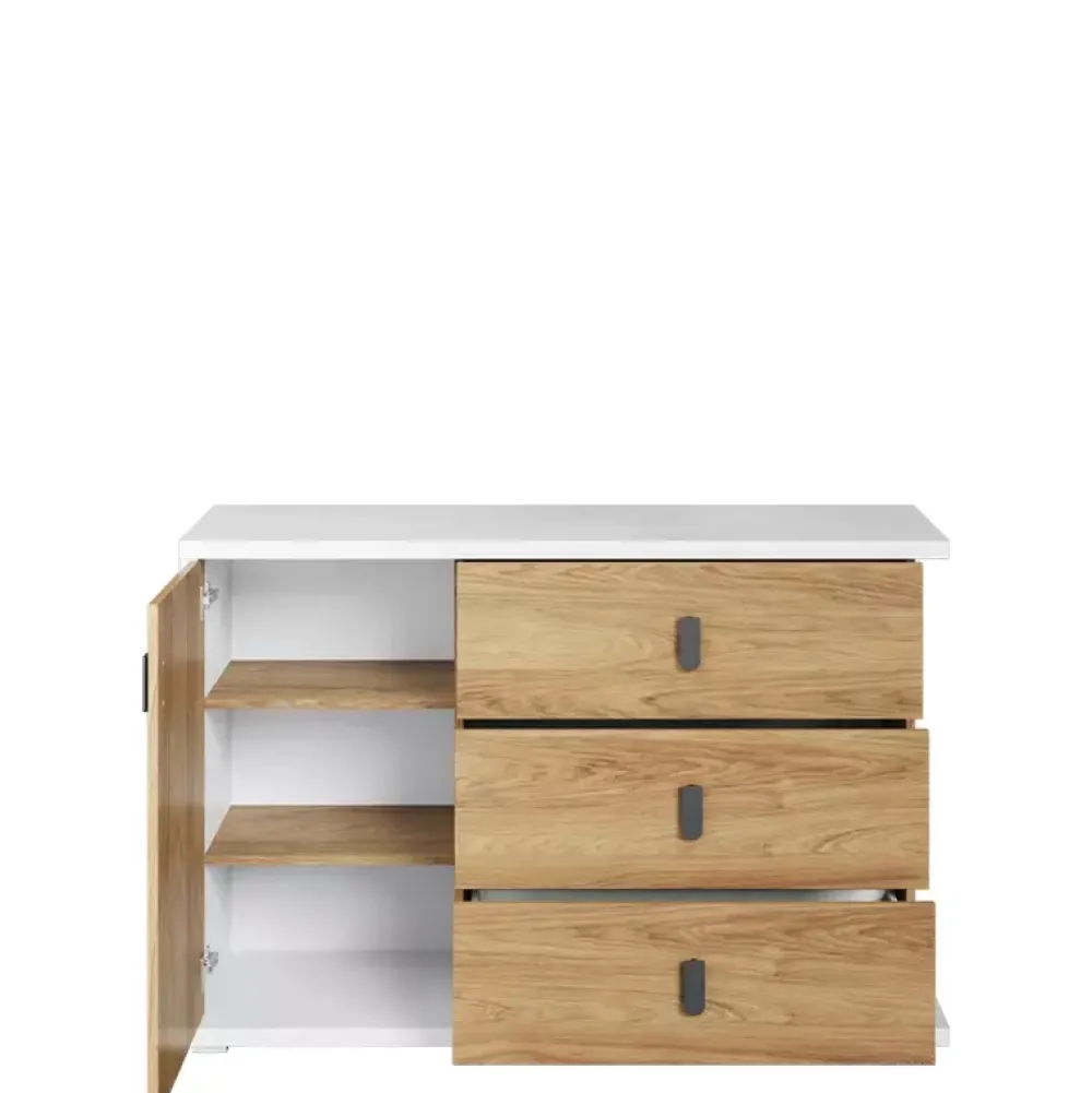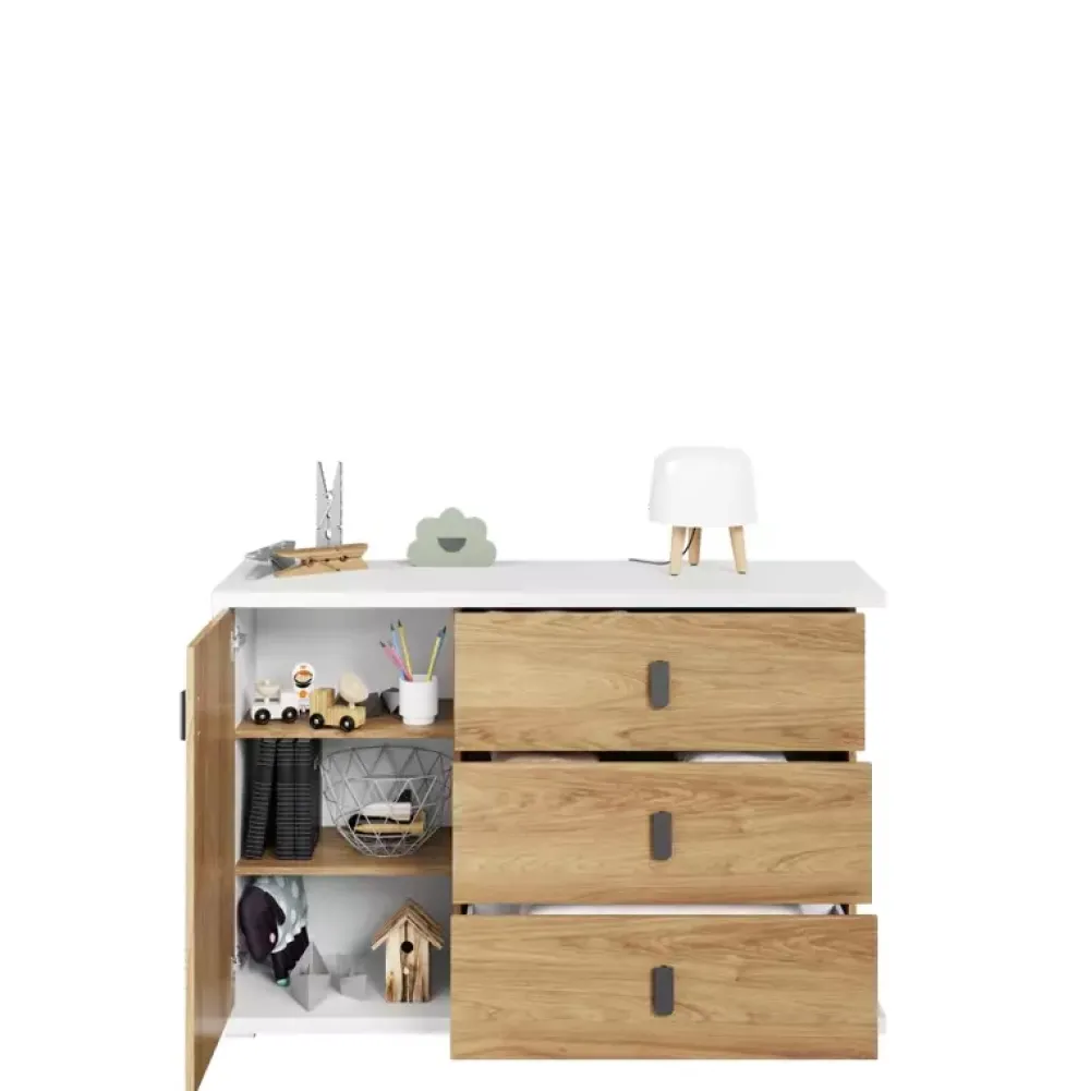 Komoda dziecięca SIMI została wyposażona w trzy pojemne szuflady metalowymi uchwytami osadzone na prowadnicach kulkowych oraz drzwi, za którymi znajdują się trzy poziomy gotowe na zagospodarowanie elementami garderoby twojej pociechy. Komoda z szufladami została wykonana w nowoczesnej stylistyce podążając za współczesnymi trendami aranżacji pokoi dziecięcych, połączenie koloru bieli alpejskiej z ciepłym kolorem dębu hikory naturalnej uczyni pomieszczenie przytulnym.