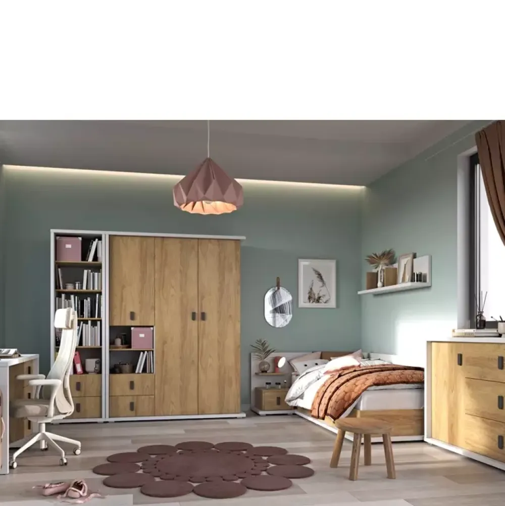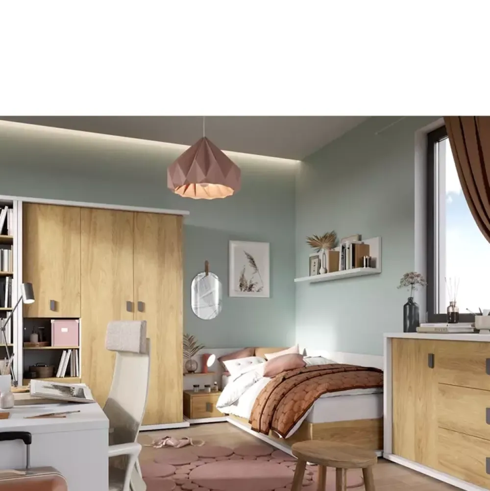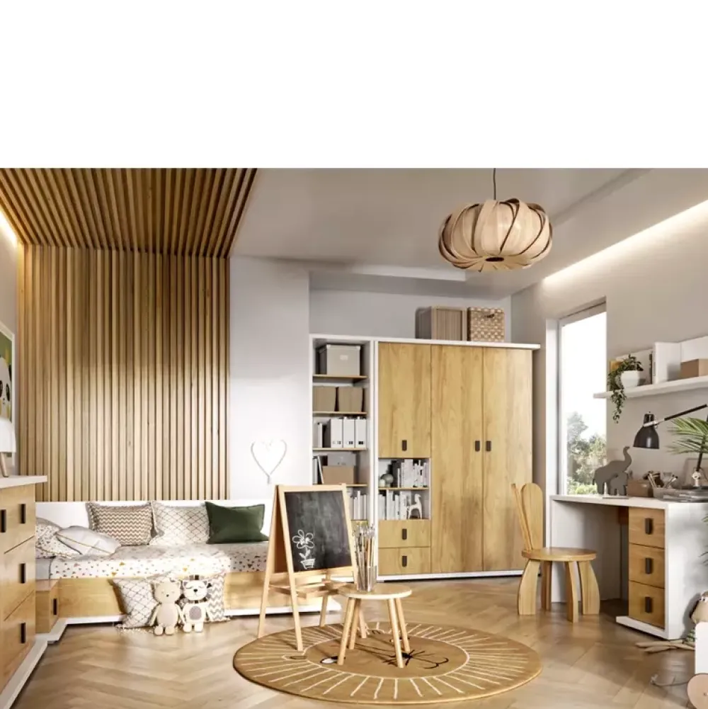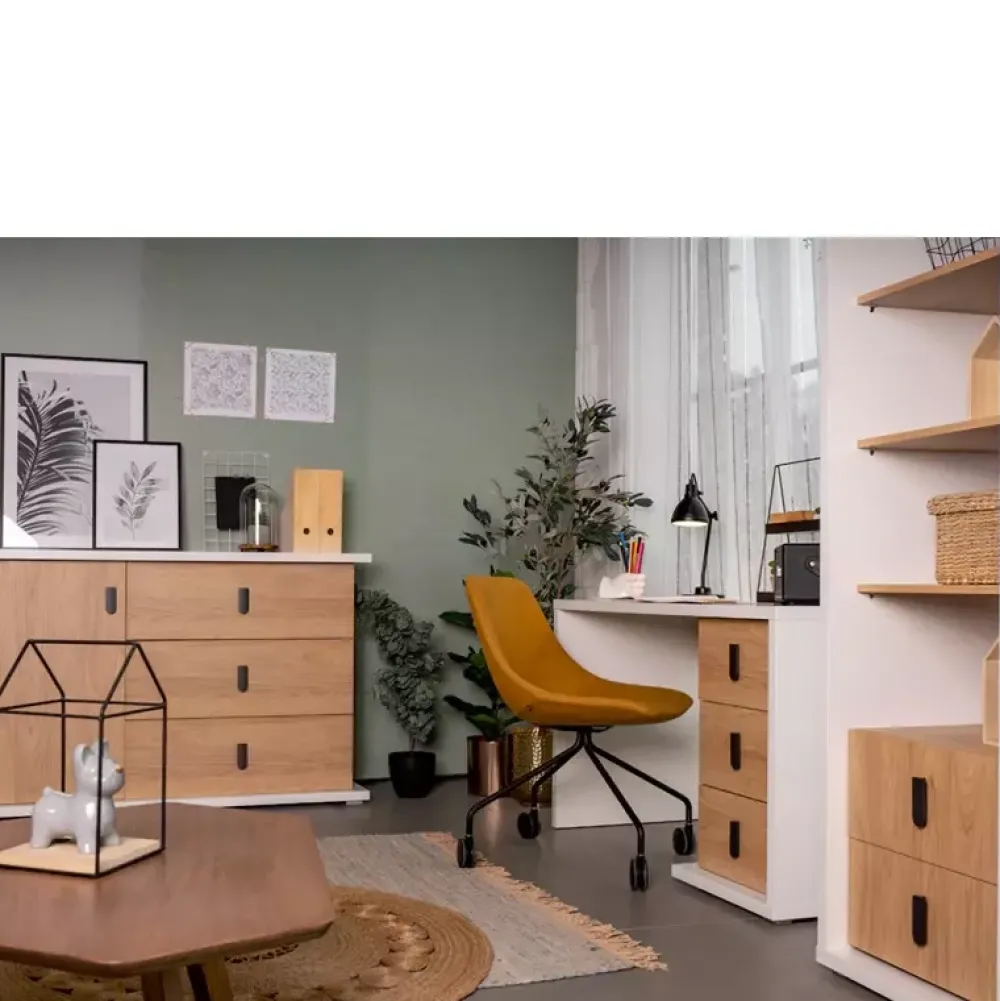Komoda dziecięca SIMI została wyposażona w trzy pojemne szuflady metalowymi uchwytami osadzone na prowadnicach kulkowych oraz drzwi, za którymi znajdują się trzy poziomy gotowe na zagospodarowanie elementami garderoby twojej pociechy. Komoda z szufladami została wykonana w nowoczesnej stylistyce podążając za współczesnymi trendami aranżacji pokoi dziecięcych, połączenie koloru bieli alpejskiej z ciepłym kolorem dębu hikory naturalnej uczyni pomieszczenie przytulnym.