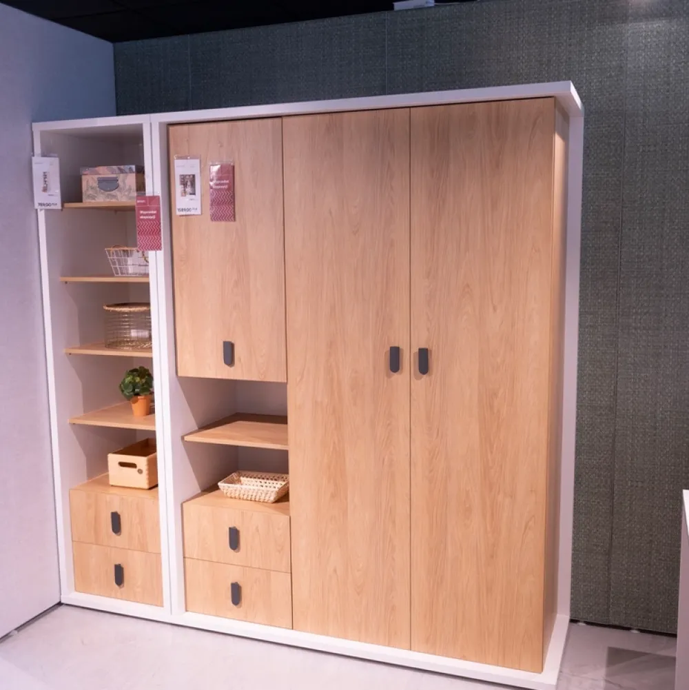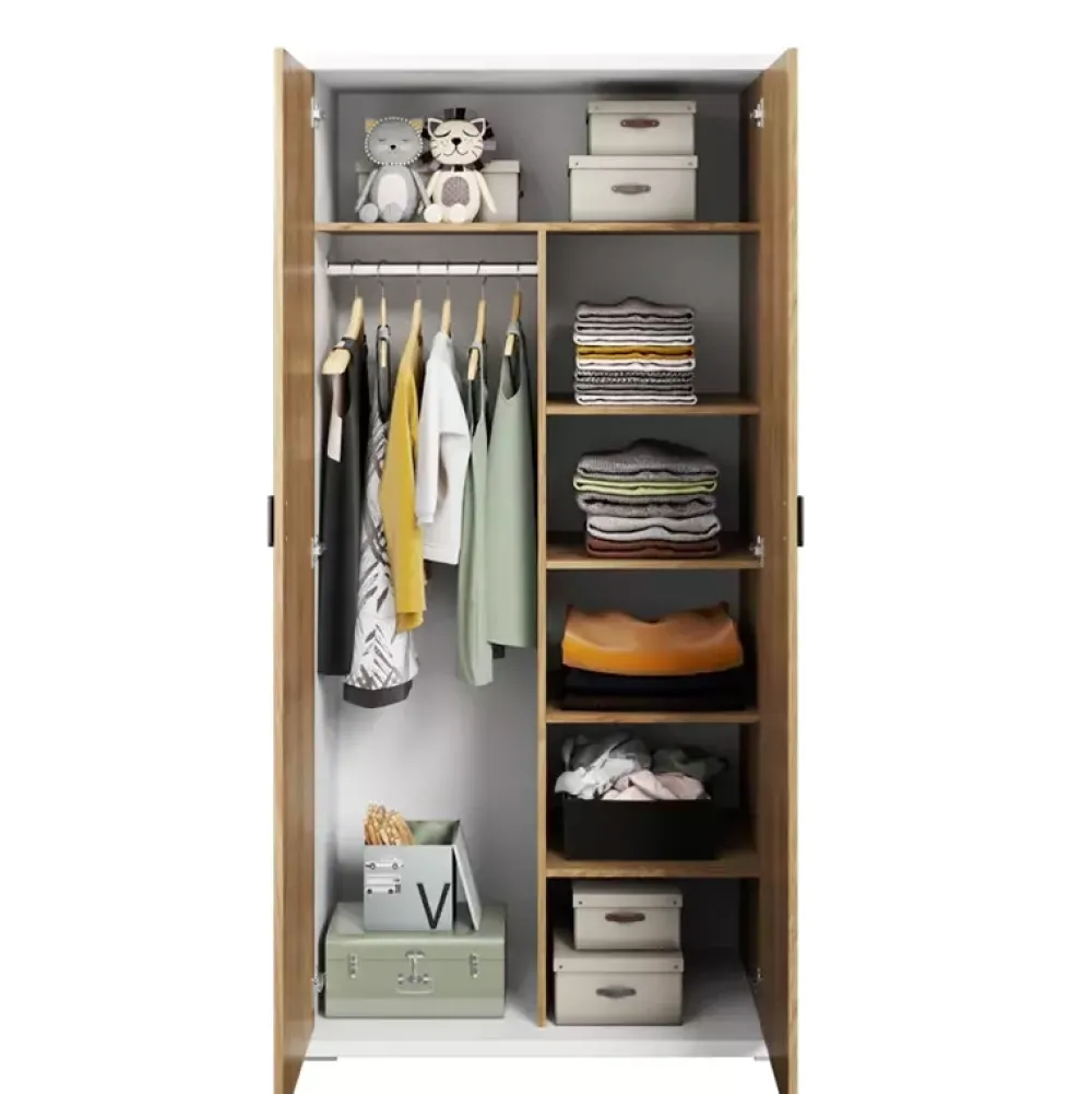 Szafa dziecięca posiada pięć półek po swojej prawej stronie, które pozwalają na rozmieszczenie rozmaitych elementów garderoby, obok których znajduje się metalowy drążek na wieszaki. Nad półkami oraz drążkiem na wieszaki znajduje się duża półka.