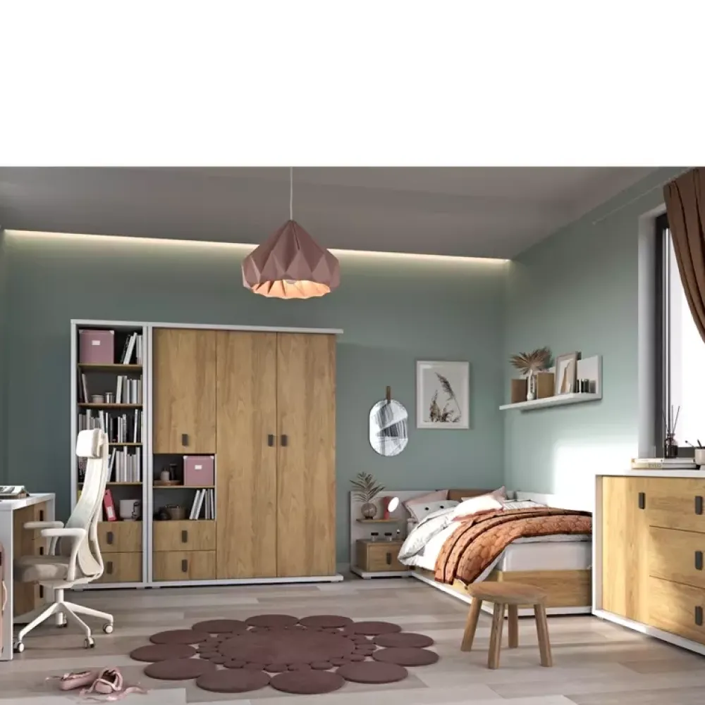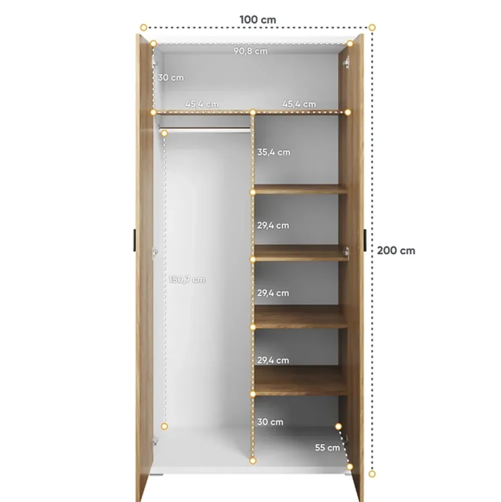 - Szafa dziecięca SIMI o szerokości 100 cm została wykonana w nowoczesnej stylistyce, dzięki której doskonale wpisuje się we współczesne trendy aranżacyjne. Szafa posiada liczne półki w swojej prawej części oraz metalowy drążek na wieszaki po prawej stronie