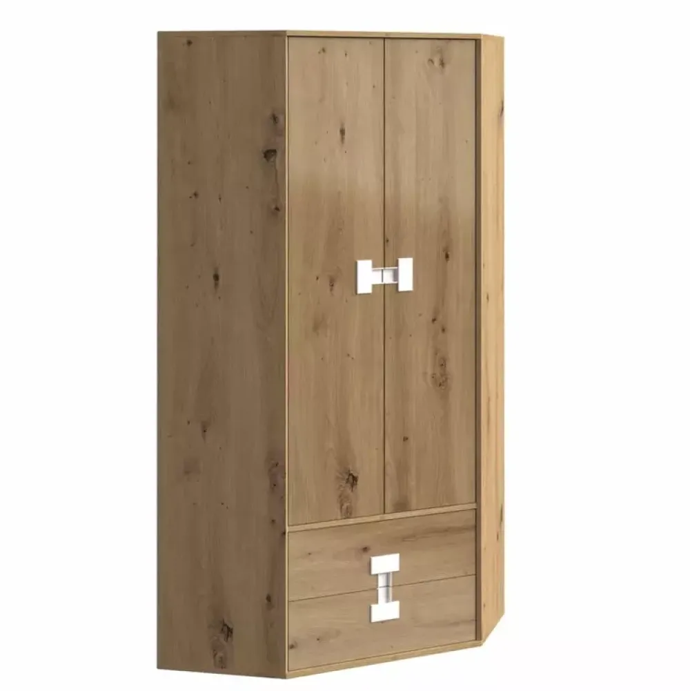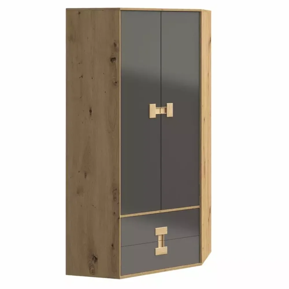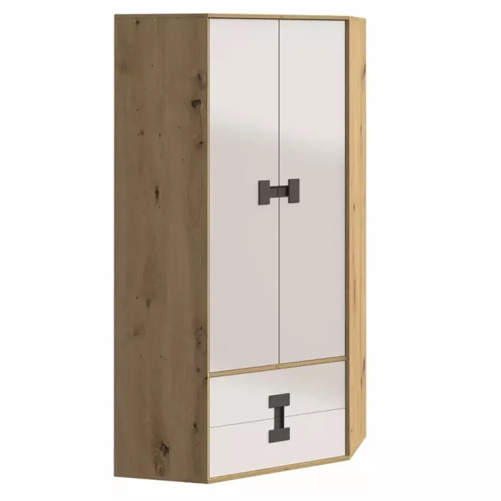 Szafa narożna z kolekcji INDEX jest idealnym rozwiązaniem dla osób chcących zagospodarować przestrzeń stylowym i modnym sposobem. Szafa narożna została wyposażona we dwie pojemne szuflady, parę drzwi, za którymi znajdziemy cztery półki ułożone w pionie. Zagospodarowano również przestrzeń na wieszaki, znajdziemy tam drążek i wiele przestrzeni na nasze ubrania.