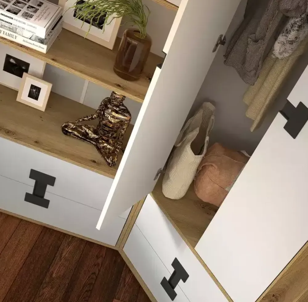 - W szafie narożnej znaleziono miejsce na dwie szuflady, oraz cztery półki i dużą przestrzeń z drążkiem na wieszaki.