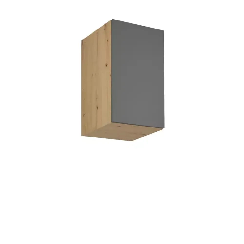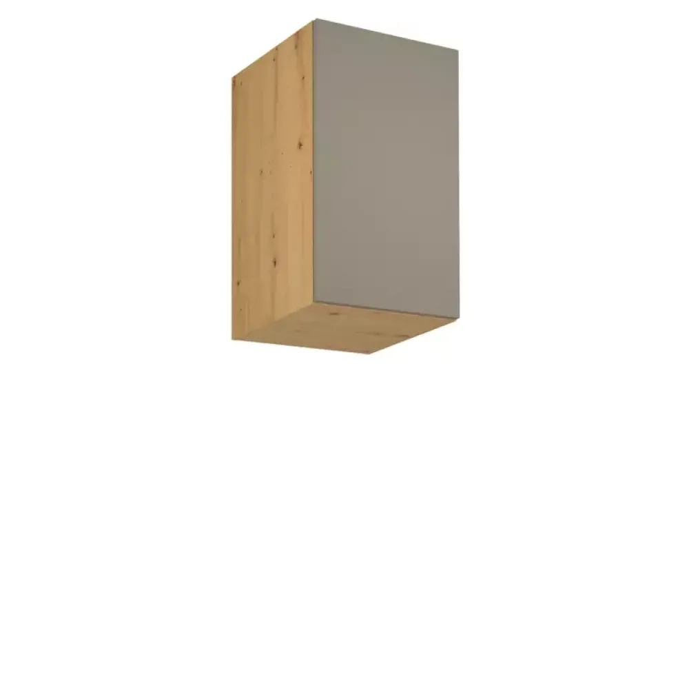 - Górna szafka kuchenna ma korpus w kolorze dąb artisan i trzy kolory frontów do wyboru w konfiguratorze „Dopasuj i kup”.