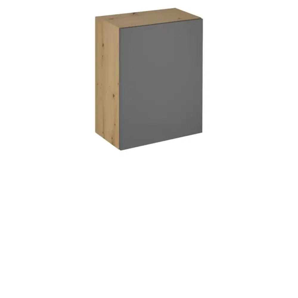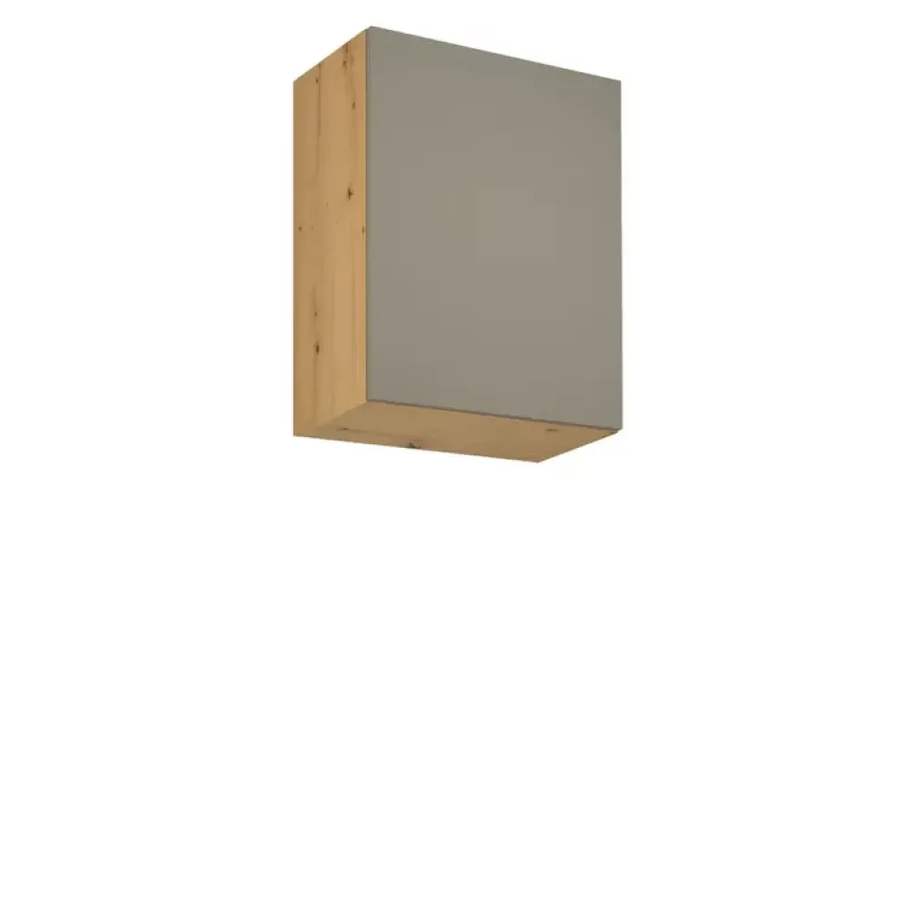- Górna szafka kuchenna ma korpus w kolorze dąb artisan i trzy kolory frontów do wyboru w konfiguratorze „Dopasuj i kup”.