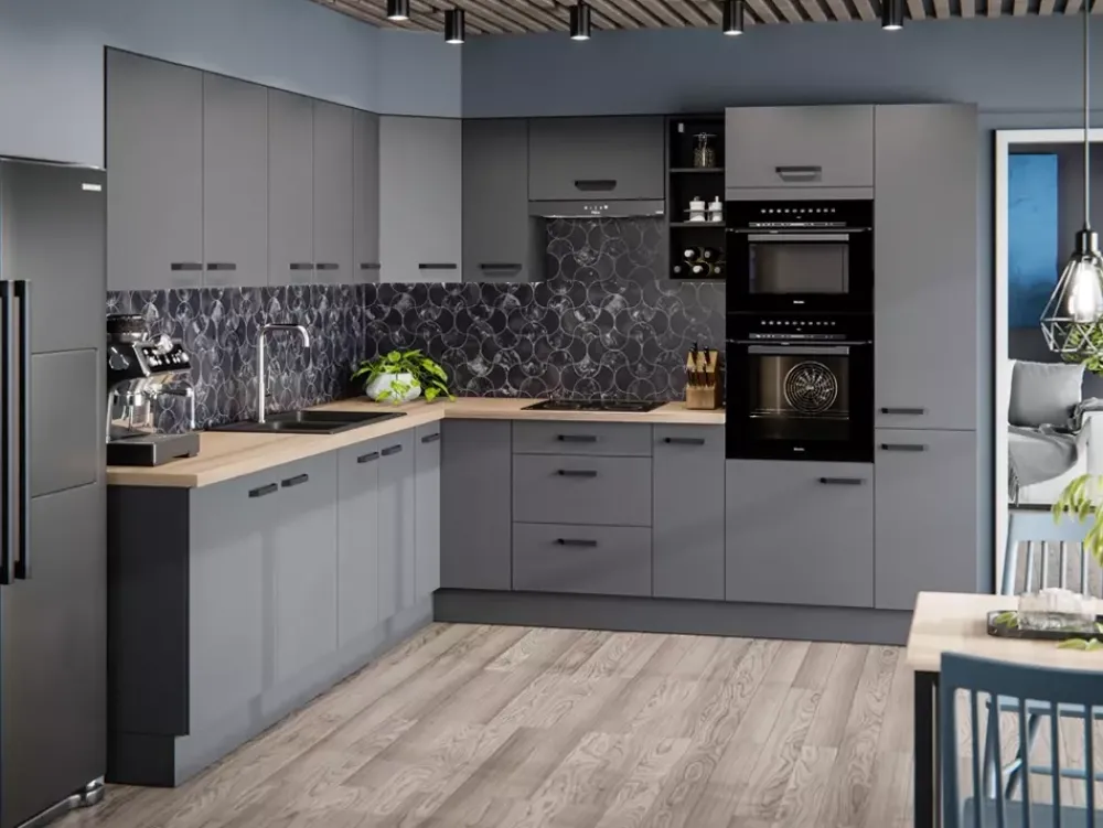Korpus i fronty naszych mebli wykonane są z trwałej płyty laminowanej, gwarantującej solidność i odporność na zarysowania oraz codzienne użytkowanie, natomiast kolor antracytu doda twojej kuchni głębi, zachowując jednocześnie czystą i uporządkowaną estetykę.
