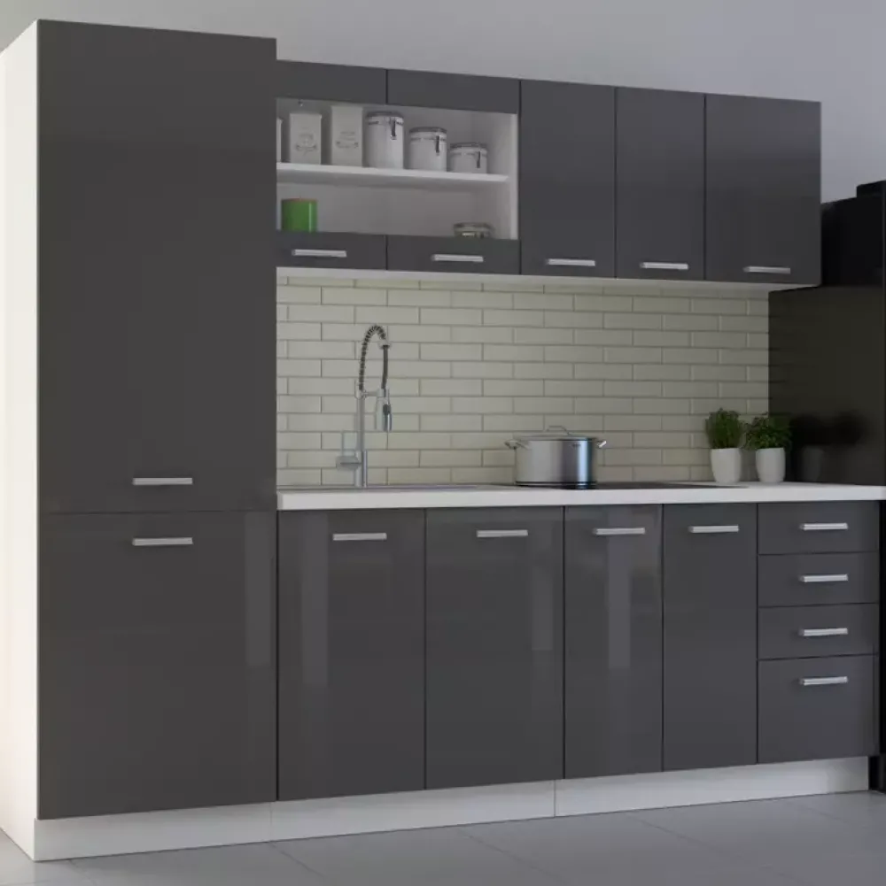 Nowoczesne kuchnie cechuje ogromna różnorodność i dowolność, jednak to szare meble kuchenne cieszą się bardzo dużą popularnością, ponieważ dopasują się do każdego wnętrza. Fronty szafek wykonane są z płyty MDF o grubości 16 mm w kolorze grafit połysk, natomiast korpusy z płyty laminowanej wykończonej obrzeżem melaminowym w kolorze białym. W kolekcji zastosowano uchwyty z tworzywa sztucznego w kolorze aluminium, które wprowadzą oryginalny i elegancki charakter do wnętrza kuchni.