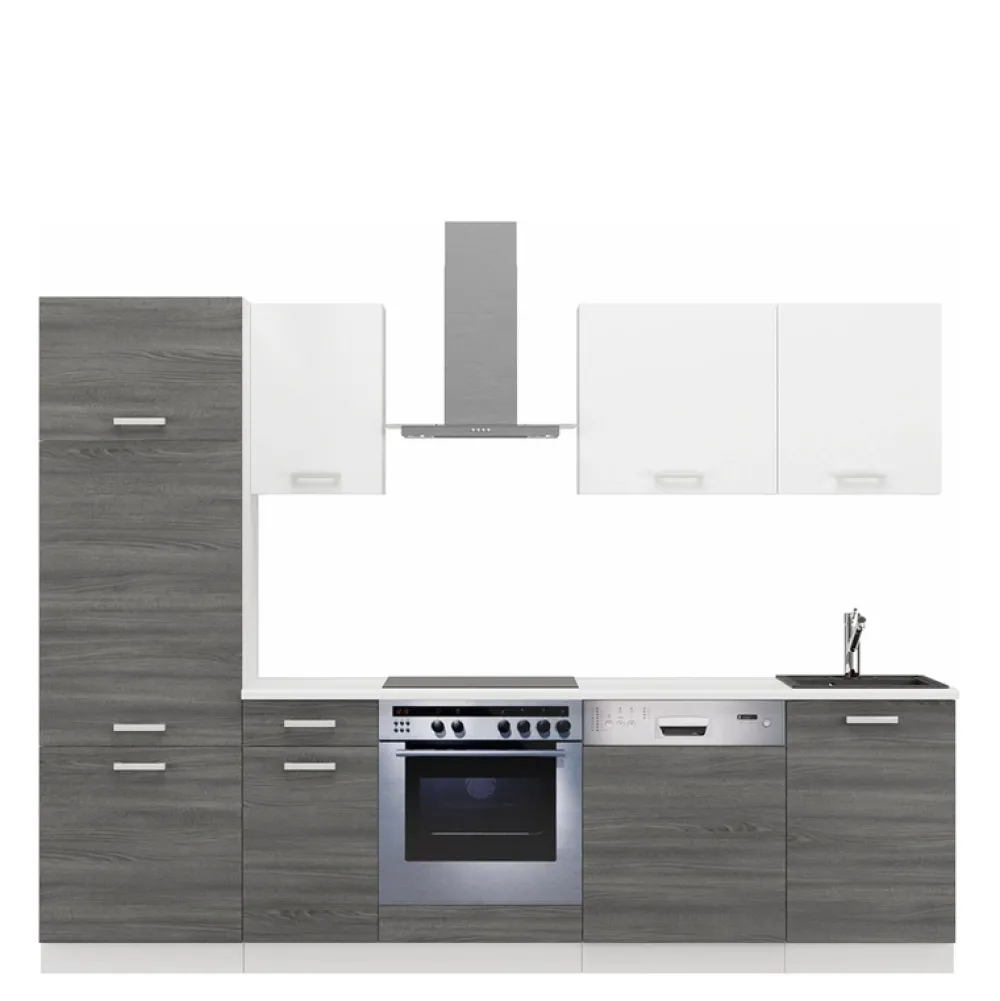 - Urządź kuchnie z zestawem TONY o szerokości 270 cm. Fronty w kolorze dąb ribbeck, ze srebrnymi uchwytami. Obrzeża z okleiny ABS oraz melaminy (korpusy). Szafki wykonane z płyty laminowanej. W zestawie dołączony jest blat oraz cokół w kolorze białym.