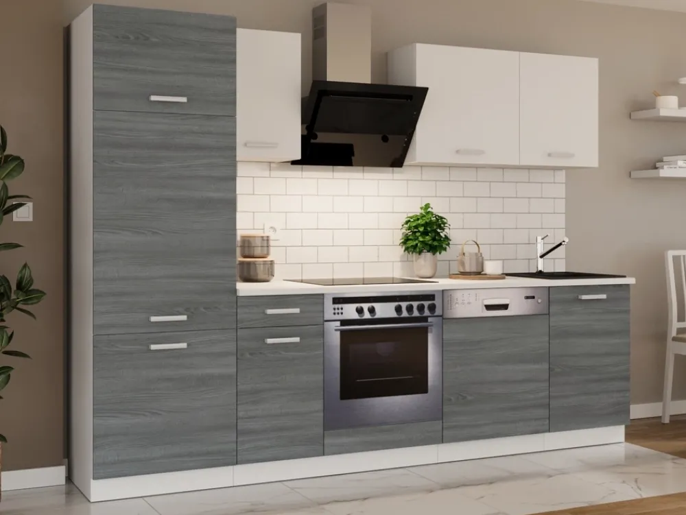 Zestaw zawiera szafki pod zabudowę lodówki, piekarnika, zlewozmywaku, a także zmywarki co pozwala na idealne wkomponowanie sprzętu AGD w przestrzeń kuchni. Dodatkowo zmywarkę można zamaskować specjalnym frontem obecnym w zestawie. Dzięki czemu całość będzie się prezentować bardzo estetycznie.