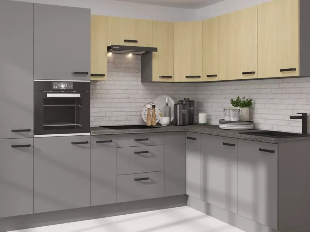 Dolna sekcja zestawu to 7 szafek z kolekcji NEPO, wykonanych w kolorze antracytu. Te wyjątkowo zaprojektowane szafki, w tym m.in. szafka narożna, szafka pod zlewozmywak oraz pod zabudowę lodówki i piekarnika, a także szafka z szufladami oferują one mnóstwo miejsca do przechowywania i organizacji, spełniając wszelkie potrzeby kuchenne.
