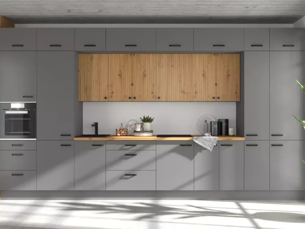 Ten duży zestaw składający się z 20 elementów to synonim designu i praktyczności. Dwanaście szafek wiszących wyróżnia się różnorodnością kolorystyczną i systemem otwierania – cztery z nich, w kolorze dąb artisan, otwierają się tradycyjnie, dodając klasycznego charakteru kuchni. Pozostałe osiem, w modnym odcieniu antracytu, jest otwieranych uchylnie, co dodaje zestawowi nowoczesnego wyglądu.