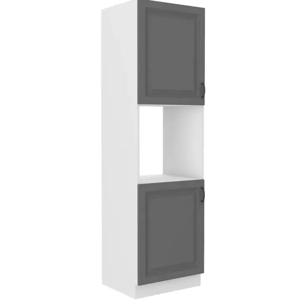Wysoka szafka pod zabudowę piekarnika ma 60 cm szerokości. W górnej części szafki znajdują się dwie wnęki, oddzielone jedną półką i tak samo wygląda to w dolnej części tej dużej szafki pod zabudowę. Zawiasy posiadają mechanizm cichego domykania, co gwarantuje delikatne zamykanie i otwieranie frontów. Szafka opiera się na cokole w kolorze korpusu. Wybierz odpowiadający Ci kolor korpusu i frontów, klikając przycisk „Dopasuj i kup”.