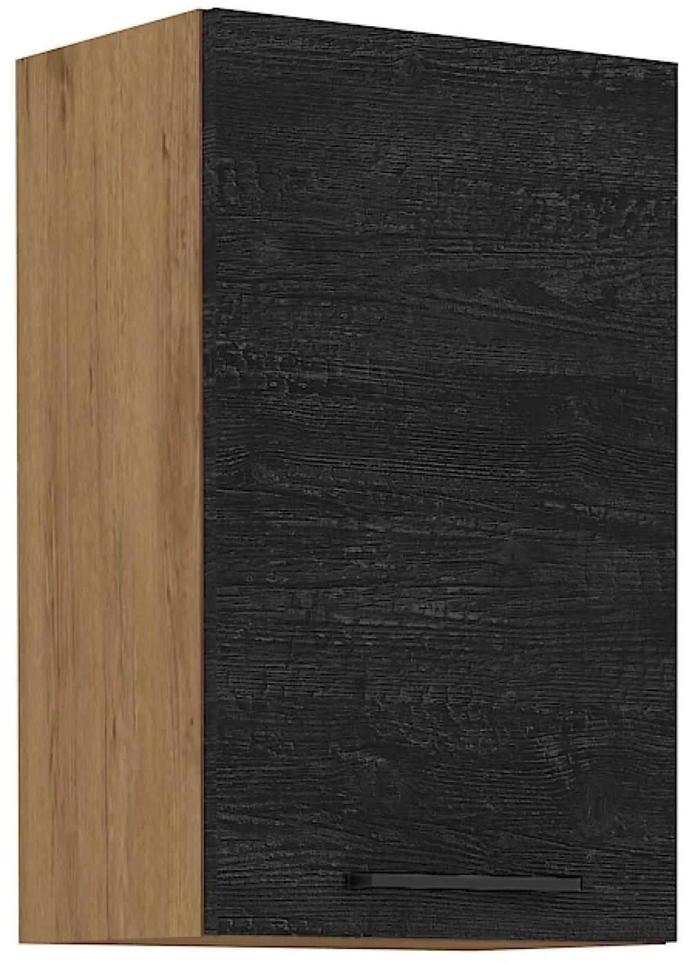 - Szafka wisząca kuchenna o szerokości 45 cm wykonana z laminowanej płyty o grubości 16 mm w kolorze Dąb Lancelot. Front szafki wykonany z płyty MDF o grubości 16 mm we wzorze ciemnego drewna. Szafka wyposażona została w system cichego domyku.