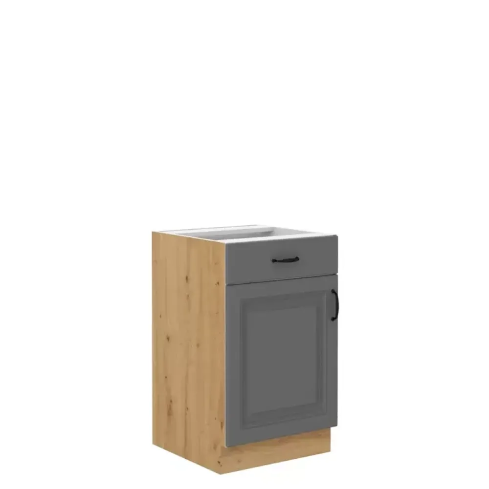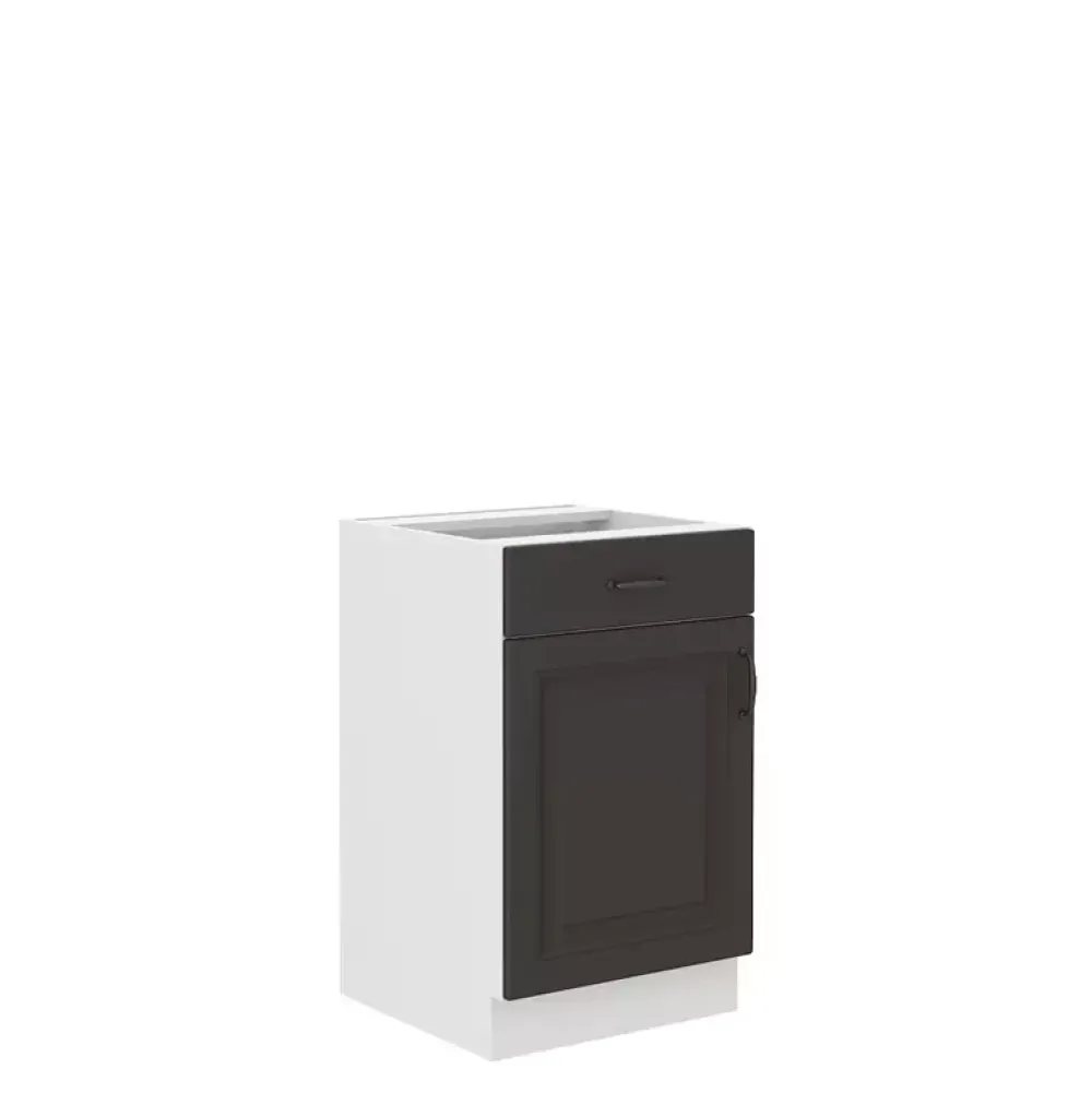 Szafka kuchenna ma 50 cm szerokości i wyposażono ją w jedną szufladę oraz jedną półkę. Zarówno zawiasy, jak i prowadnice posiadają mechanizm cichego domykania, co gwarantuje delikatne zamykanie i otwieranie frontów. Szafka opiera się na cokole w kolorze korpusu. Wybierz odpowiadający Ci kolor korpusu i frontów, klikając przycisk „Dopasuj i kup”.