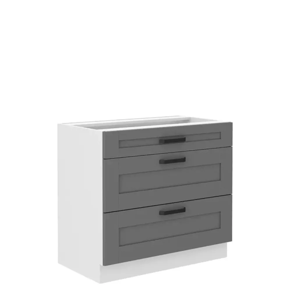 Stojąca szafka kuchenna AWINION ma 80 cm szerokości i posiada trzy pojemne szuflady typu PREMIUM BOX, które charakteryzują się udźwigiem do 35 kg, więc zyskasz z nią miejsce do przechowywania sztućców, garnków, czy zapasów żywności. Prowadnice z systemem cichego domykania zagwarantują delikatne zamykanie i otwieranie szuflad. Szafka opiera się na cokole w kolorze korpusu. Wybierz odpowiadający Ci kolor korpusu i frontów, klikając przycisk „Dopasuj i kup”.