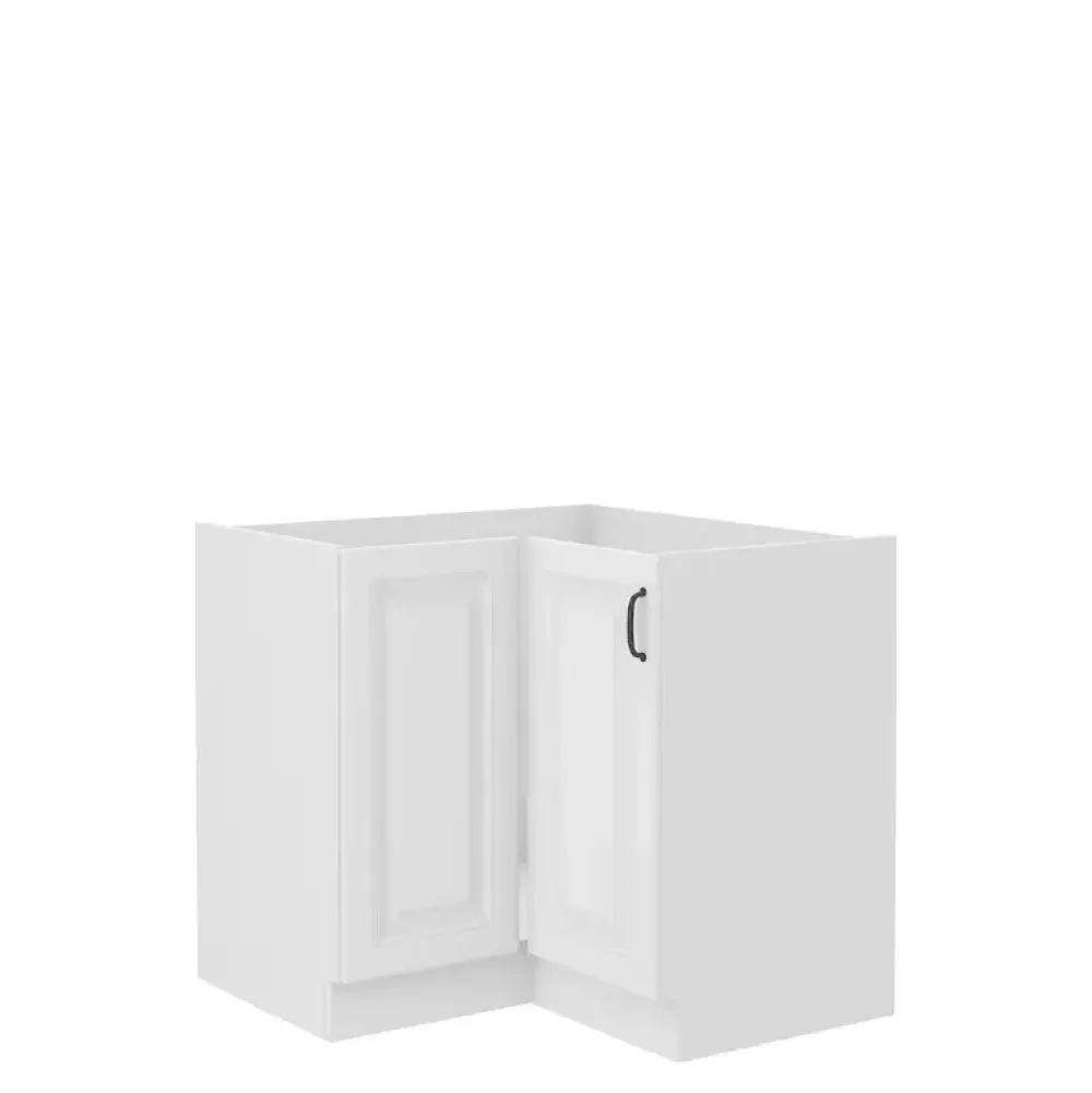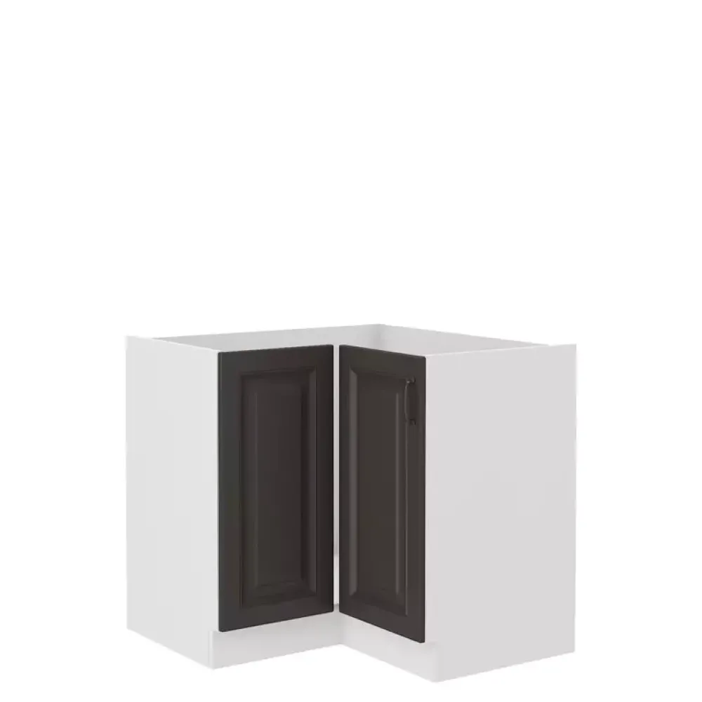 Stojąca szafka narożna będzie idealnym miejscem na garnki, czy inne kuchenne akcesoria. Szafka posiada jedną półkę, a jej front składa się z dwóch części, połączonych ze sobą na zawiasach. Pociągając za uchwyt, otwierasz obie części. Szafka posiada proste zawiasy, bez systemu cichego domykania. Szafka opiera się na cokole w kolorze korpusu.