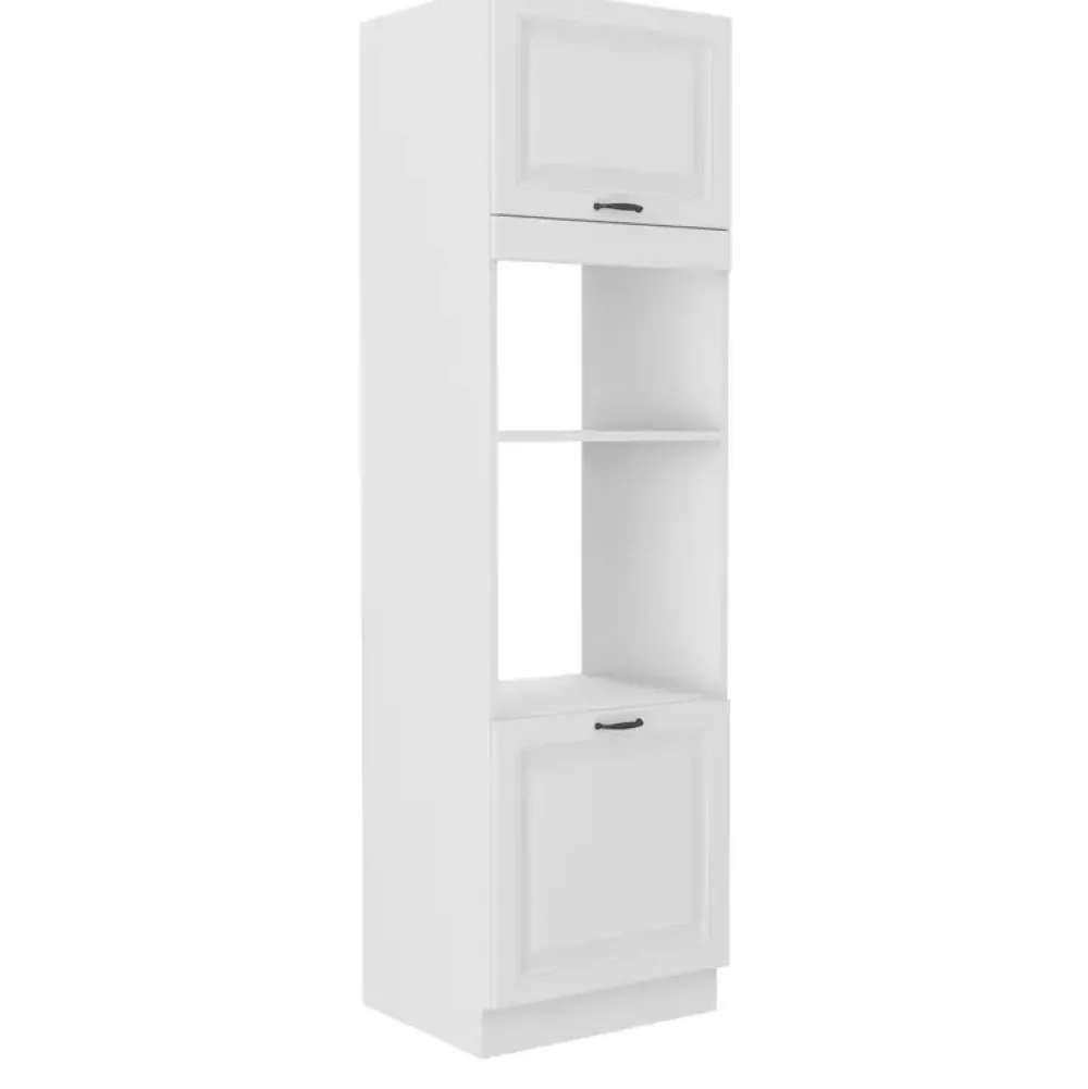 Wysoki słupek kuchenny ma 60 cm szerokości i jest przystosowany pod zabudowę piekarnika i mikrofali. Szafka idealnie sprawdzi się pod przechowywanie zapasów żywności, jak i drobnych akcesoriów kuchennych, ponieważ ma również półki ukryte za zamykanymi drzwiami. Zawiasy posiadają mechanizm cichego domykania, co gwarantuje delikatne zamykanie i otwieranie drzwi. Szafka opiera się na cokole w kolorze korpusu. Wybierz odpowiadający Ci kolor korpusu i frontów, klikając przycisk „Dopasuj i kup”.