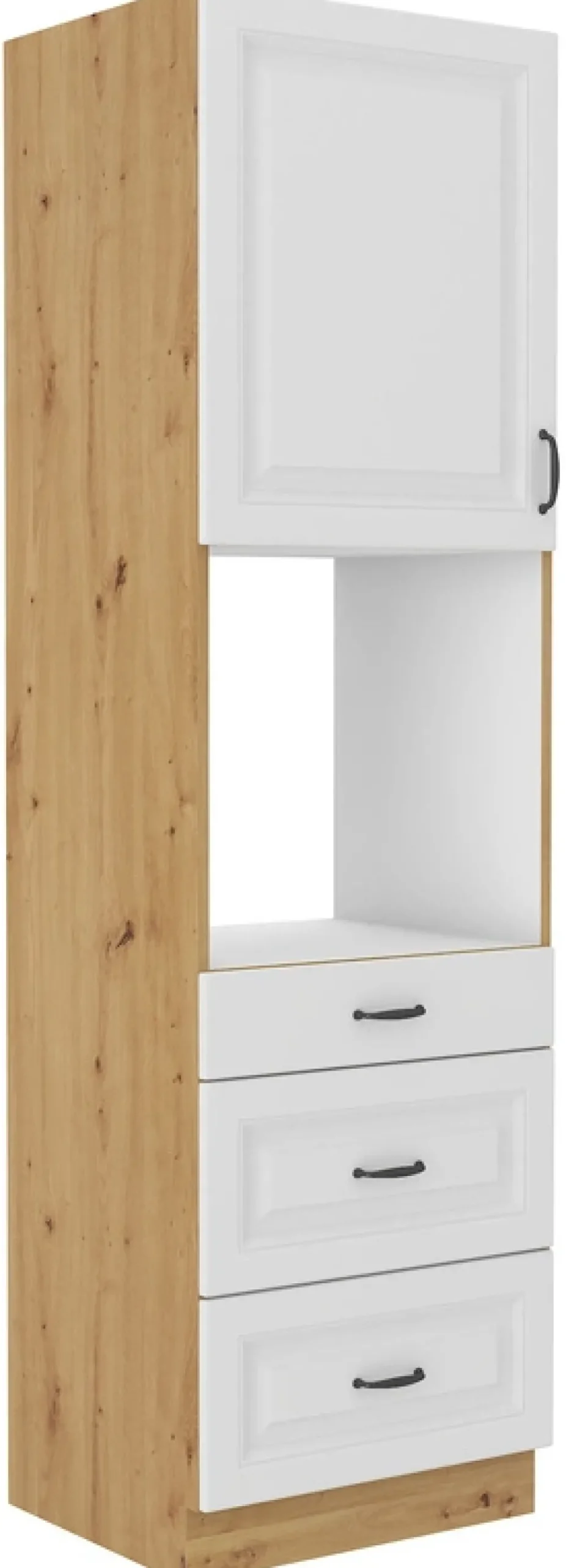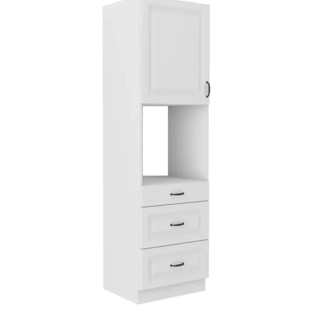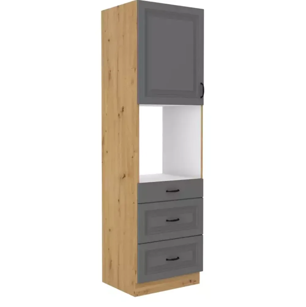 - Wysoka szafka pod zabudowę piekarnika ms 60 cm szerokości i została wyposażona w jedną półkę i trzy szuflady.
