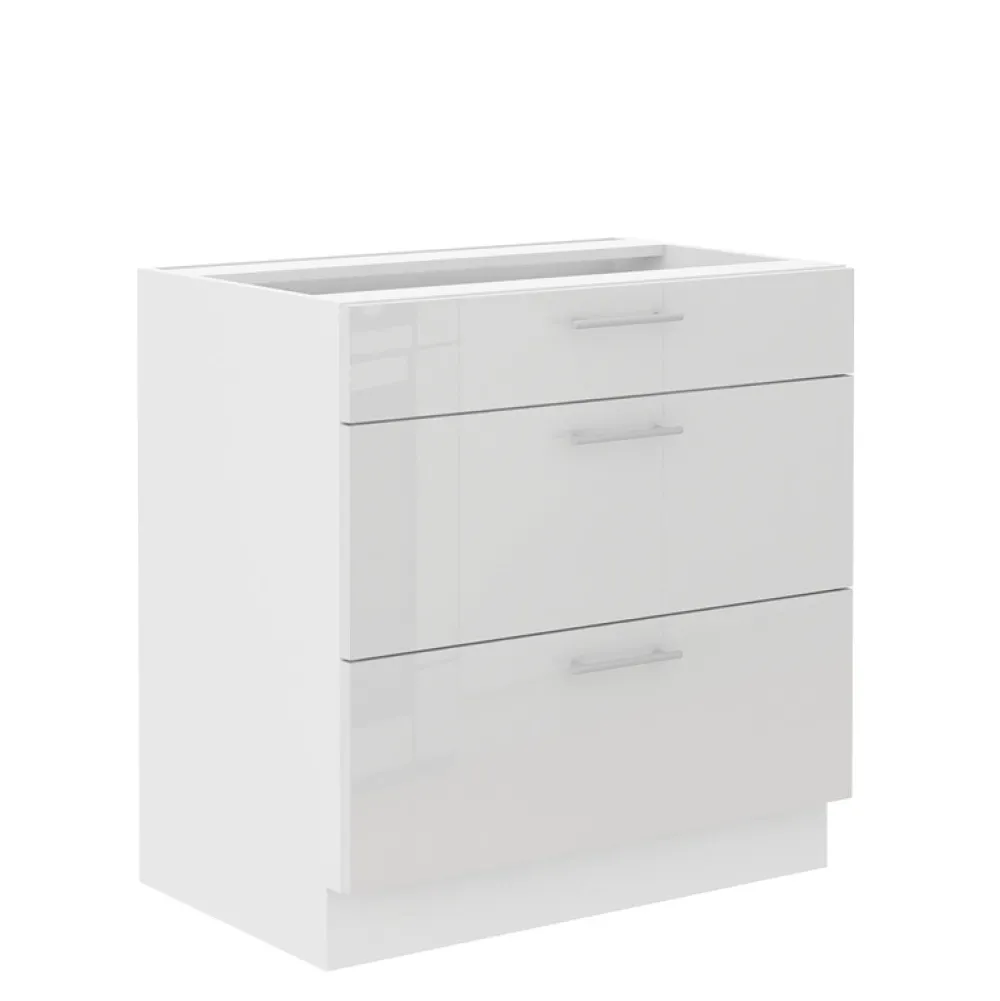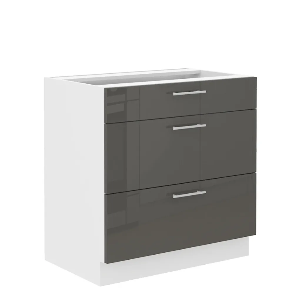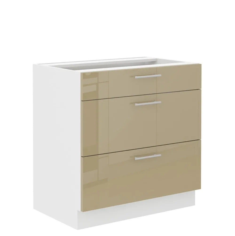 - Front szafki kuchennej wykonany jest z płyty MDF w trzech kolorach wykończonych na wysoki połysk: biały, szary oraz cappucino.