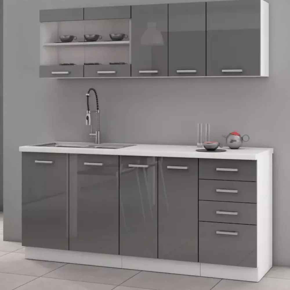 Nowoczesne kuchnie cechuje ogromna różnorodność i dowolność, jednak to szare meble kuchenne cieszą się bardzo dużą popularnością, ponieważ dopasują się do każdego wnętrza. Fronty szafek wykonane są z płyty MDF o grubości 16 mm w kolorze grafit połysk, natomiast korpusy z płyty laminowanej wykończonej obrzeżem melaminowym w kolorze białym. W kolekcji zastosowano uchwyty z tworzywa sztucznego w kolorze aluminium, które wprowadzą oryginalny i elegancki charakter do wnętrza kuchni.