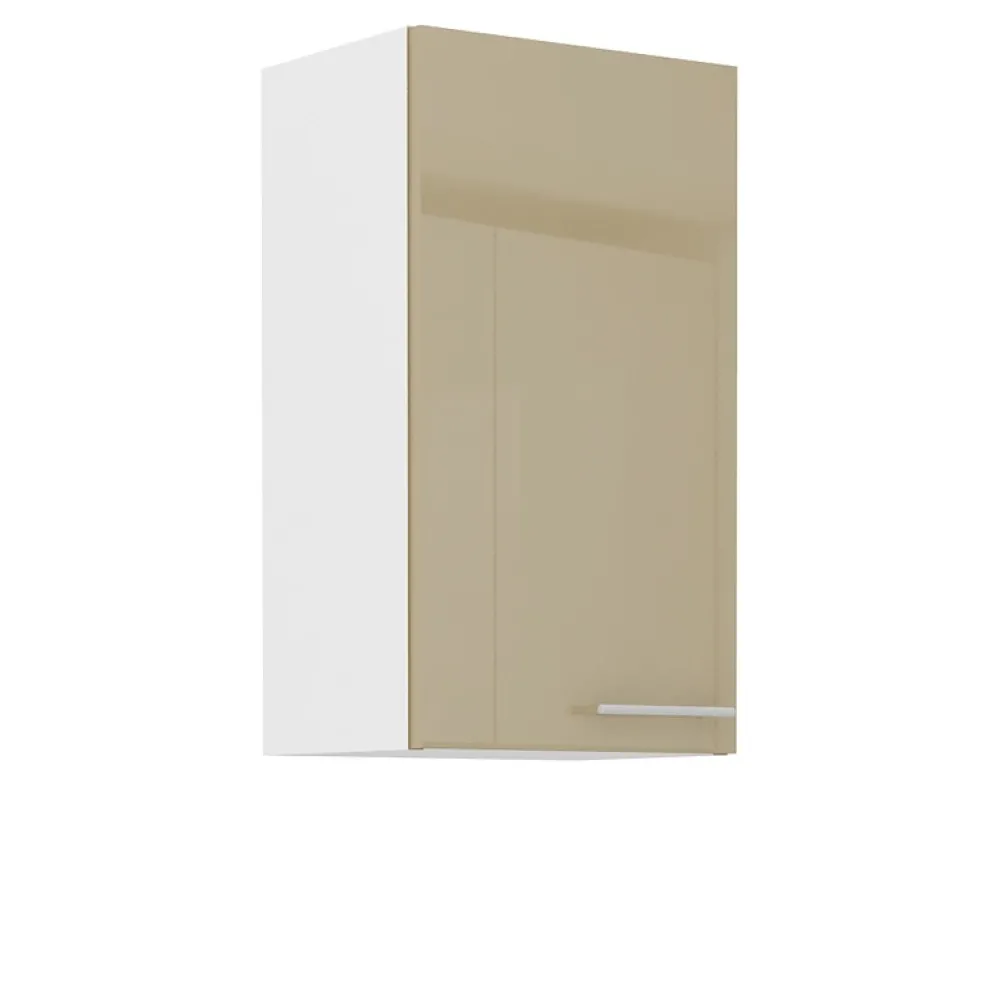 - Front szafki kuchennej wykonany jest z płyty MDF w trzech kolorach wykończonych na wysoki połysk: biały, szary oraz cappucino.