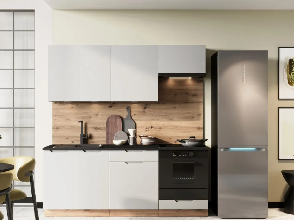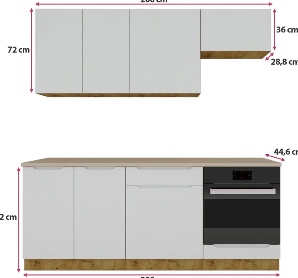 Zestaw mebli kuchennych o szerokości 200 cm ISABEL to doskonałe rozwiązanie do kuchni, w której liczy się zarówno estetyka, jak i ergonomia. Górne szafki zapewniają przestrzeń do przechowywania niezbędnych akcesoriów kuchennych. Szafka z okapem o szerokości 60 cm idealnie pasuje nad kuchenkę, zapewniając eleganckie i dyskretne miejsce na system wentylacyjny. Obok znajduje się szafka jednodrzwiowa z półką (60 cm), idealna na przyprawy i drobne przedmioty, a większa szafka dwudrzwiowa (80 cm) doskonale sprawdzi się do przechowywania naczyń czy zastawy stołowej.