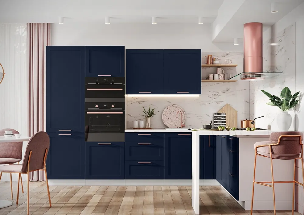 Jeśli pociąga Cię styl glamour, zestaw atramentowy granat ze złotymi lub miedzianymi uchwytami.