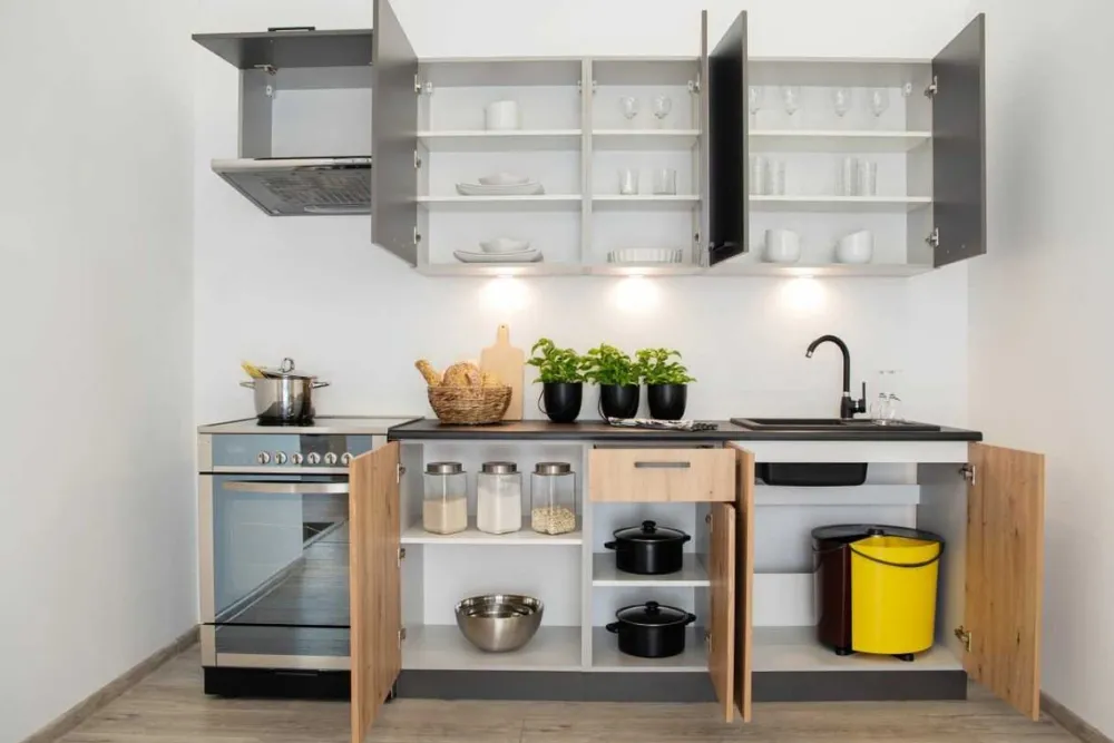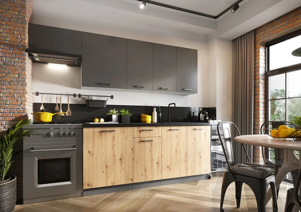 Odcienie drewna i grafitu dodają wnętrzom lekkości i nowoczesności, tworząc harmonijną całość ze strefą dzienną. Bez względu na to, czy urządzasz małą kuchnie w bloku, czy duży salon z kuchnią, szafki kuchenne na sztuki powinny wzbudzić Twoje zainteresowanie.
