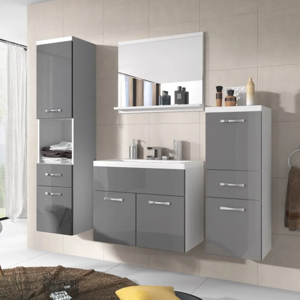 Komplet podwieszanych szafek łazienkowych to sposób na poprawę komfortu użytkowania (sprzątania) łazienki. W skład zestawu wchodzą: szafka z umywalką, dwa słupki łazienkowe oraz lustro z półką.