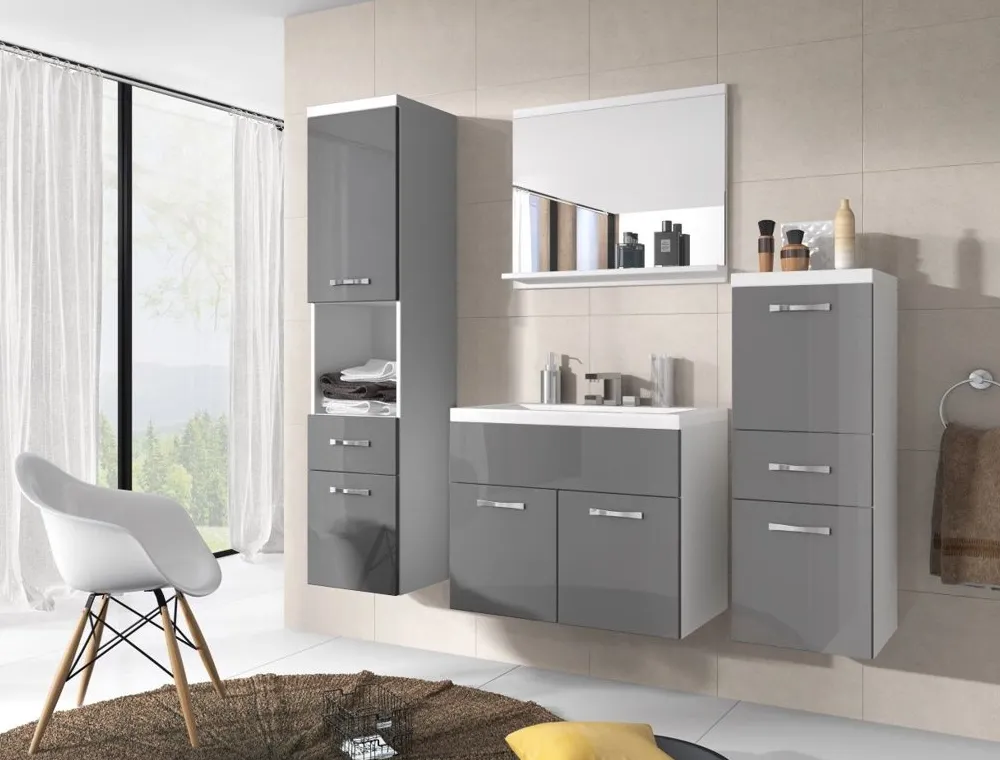 Meble łazienkowe z frontami na wysoki połysk i nie tylko.