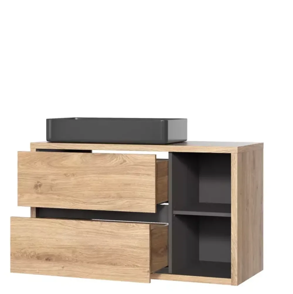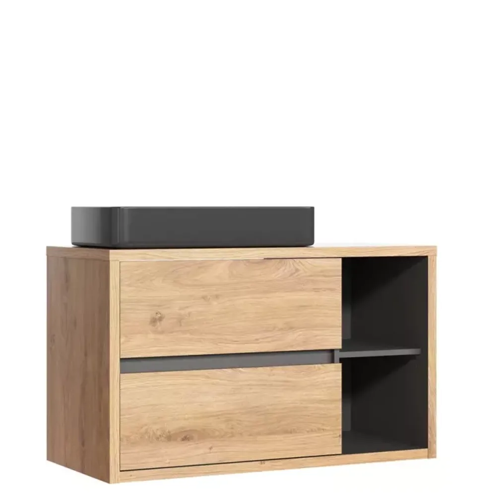 Nowoczesne meble łazienkowe, utrzymane w uniwersalnej, a zarazem modnej kolorystyce tak w skrócie opisać można kolekcje DREX. Korpusy oraz fronty wykonano z płyty laminowanej w kolorach Dąb Shetland, oraz Grafit. Szafki oraz szuflady wyposażono w system bezgłośnego domykania Soft Close. DREX to wysoka jakość materiałów połączona z przemyślanym projektem oferującym niewiarygodnie dużo miejsca do przechowywania w łazience, czyli w pomieszczeniu gdzie miejsce jest na wagę złota.