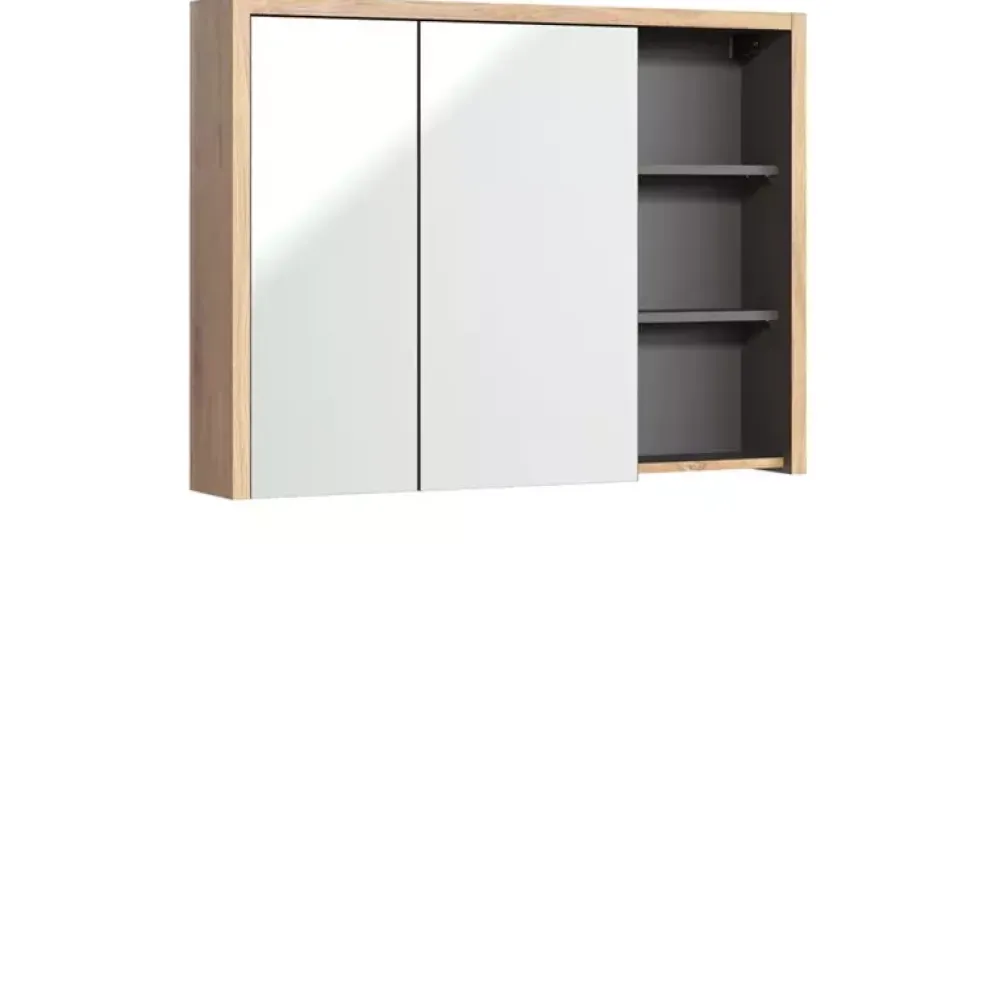 - Kompletny zestaw mebli łazienkowych wraz z umywalką, szafką pod umywalkę, wysokim słupkiem oraz szafką wiszącą z lustrem.