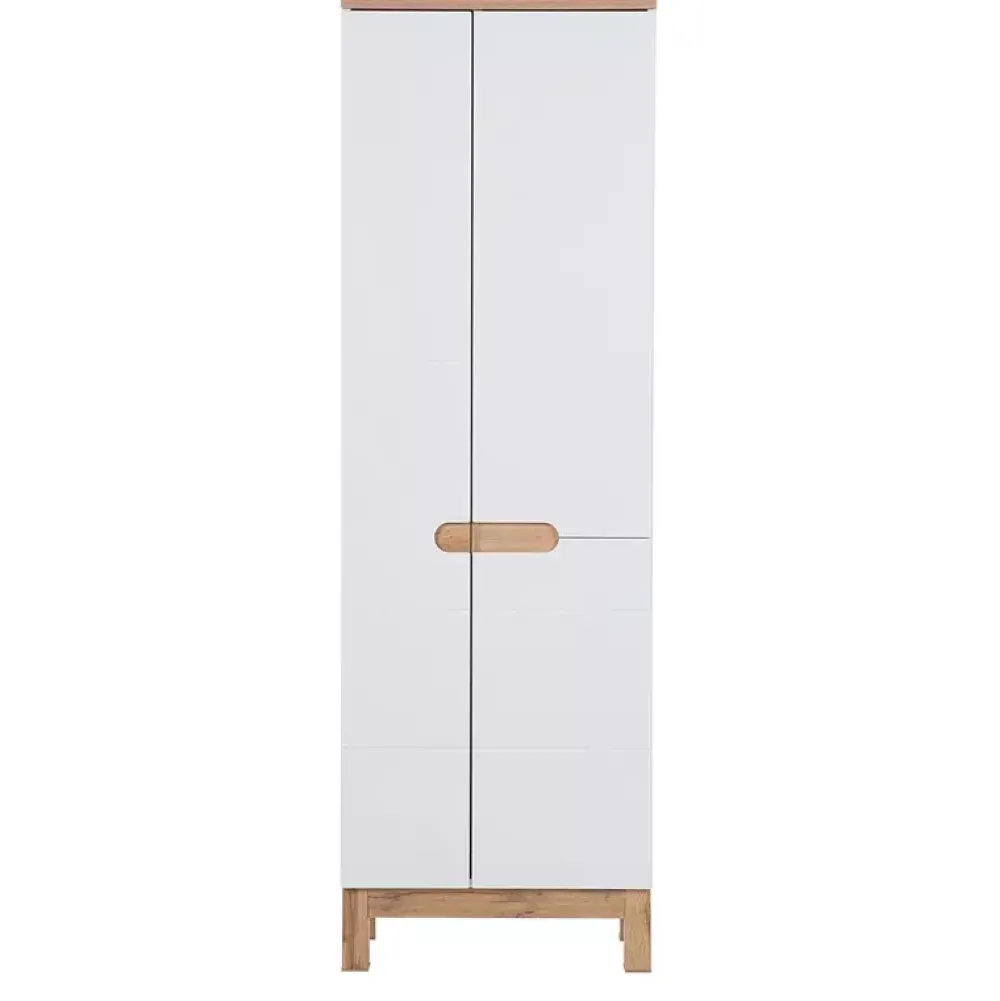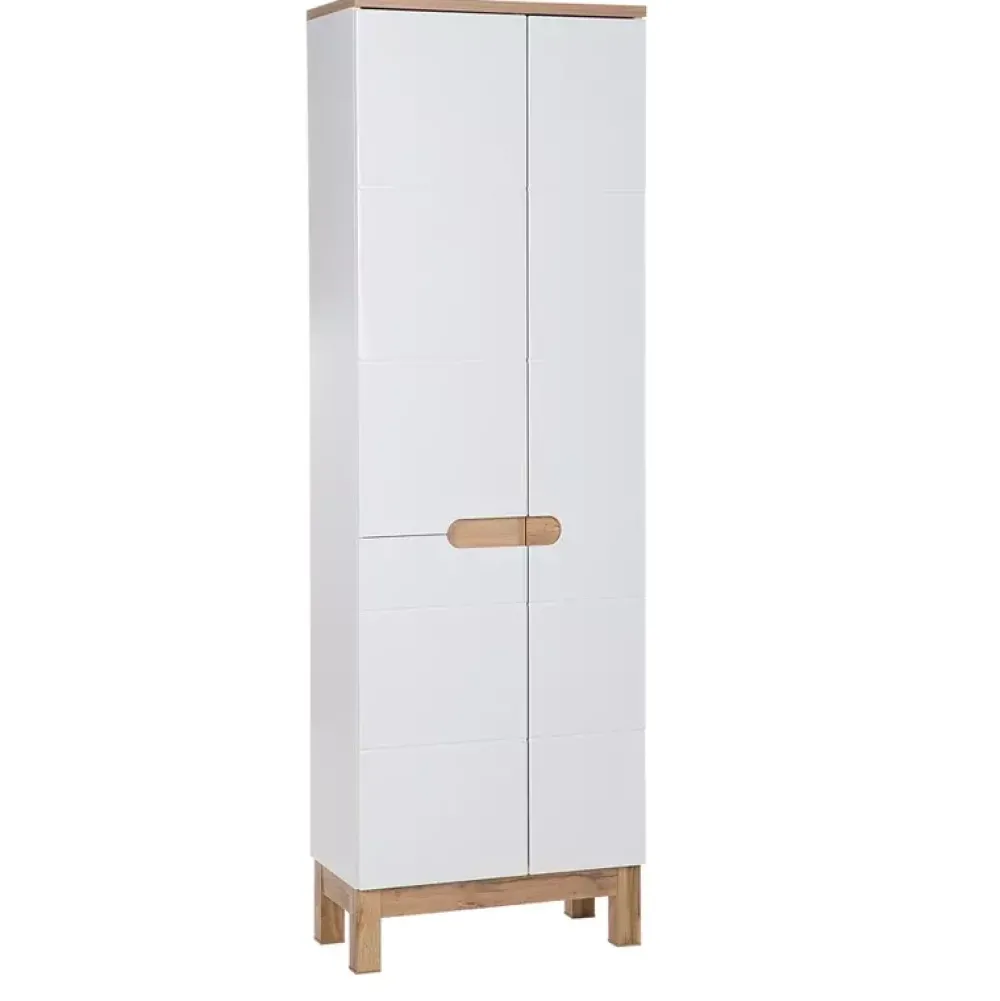 - Wysoka szafka łazienkowa z miejscem do przechowania mopa, wnętrze zaaranżowano również na trzy półki.