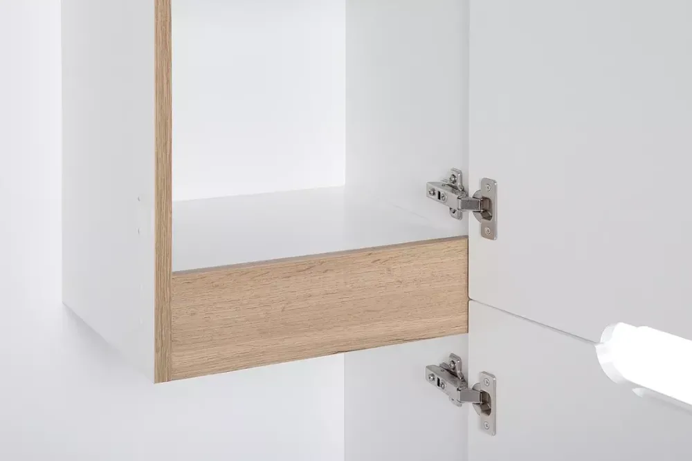 - Fronty wykonane z płyty MDF powlekane PCV wykończonej na wysoki połysk w kolorze Biały Kasai.