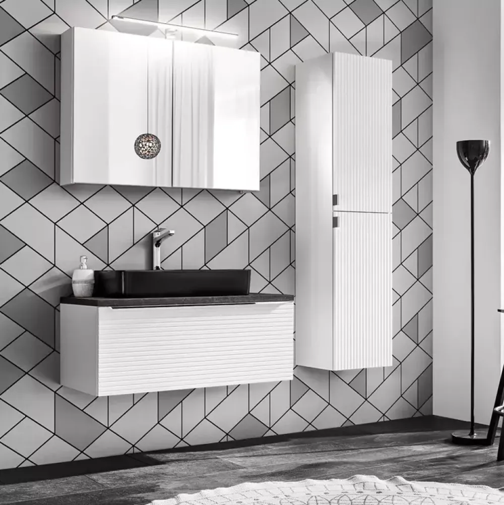 - Korpus szafki oraz ryflowany front wykonano z płyty MDF odpornej na wilgoć w kolorze białym.