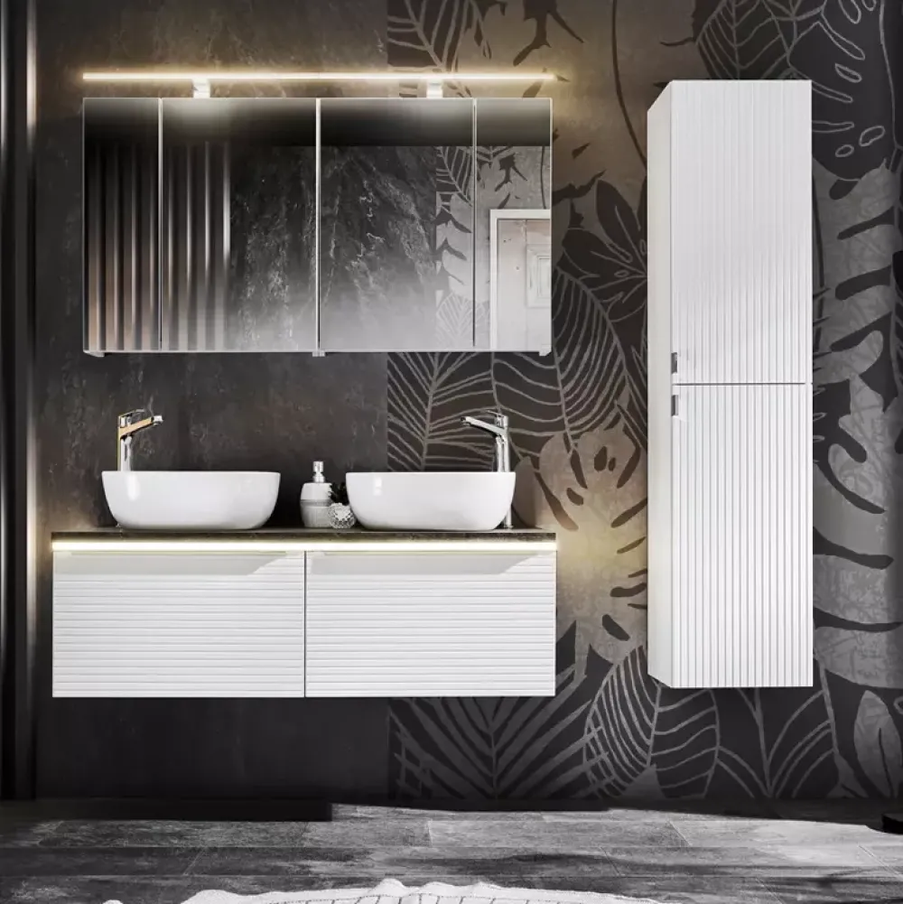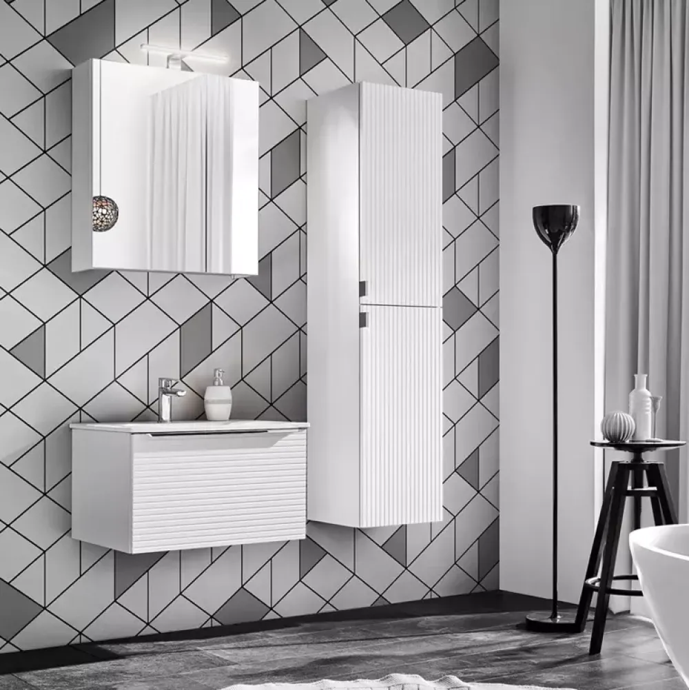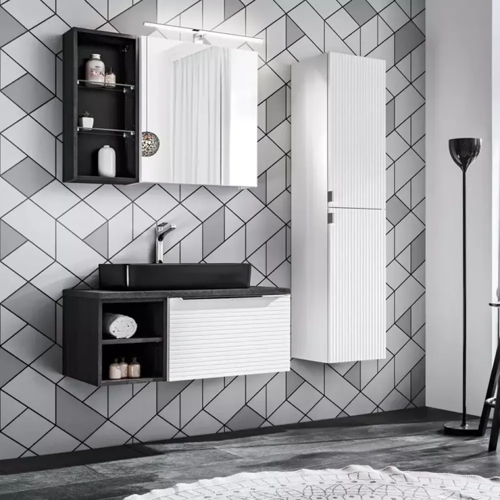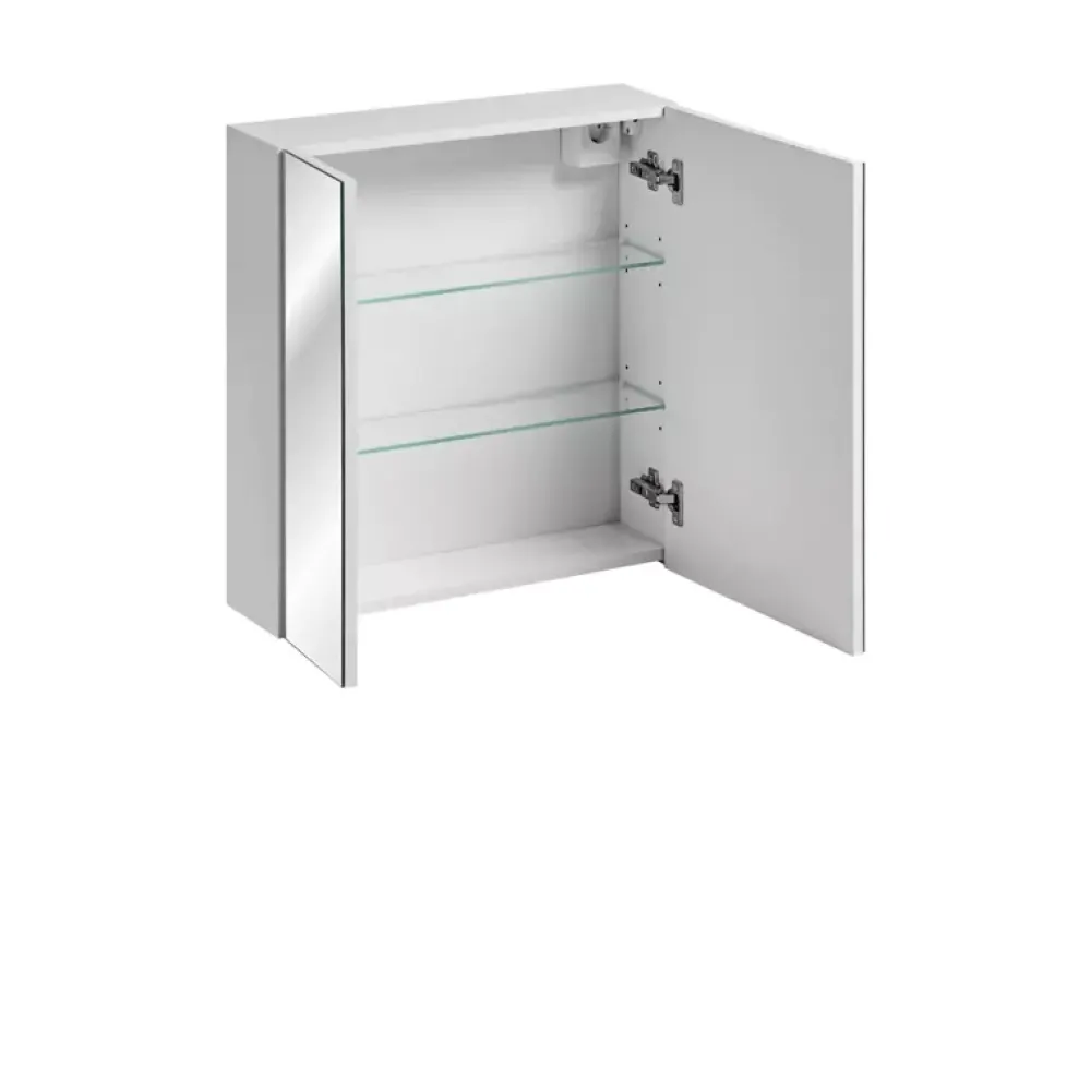 Szafka wisząca LOSELANI została wyposażona w parę drzwi z lustrem umieszczonych na zawiasach wzbogaconych bezgłośnym systemem cichego domyku. Za drzwiami szafki znajdują się trzy poziomy, w skład których wchodzą dwie półki wykonane ze szkła hartowanego, które doskonale sprawdzą się do przechowania akcesoriów higieny osobistej. Dodatkowo nowoczesna stylistyka szafki sprawia, że odnajduje się ona we współczesnych aranżacjach łazienek.