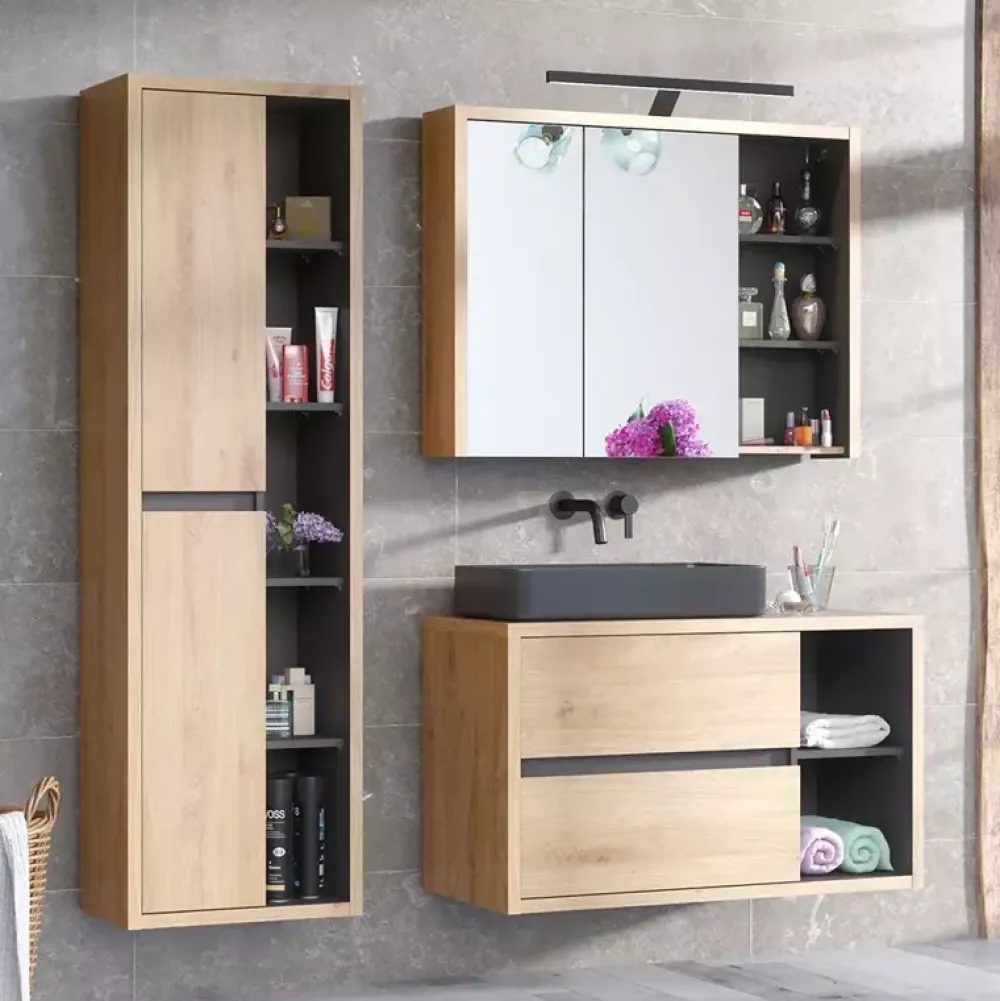 - Nowoczesny słupek łazienkowy w kolorystyce dąb shetland w połączeniu z grafitowymi wstawkami.