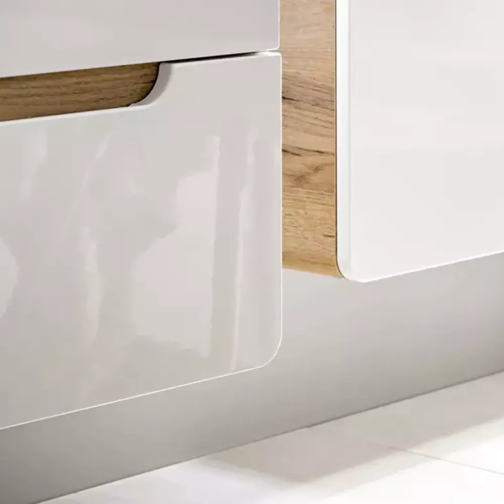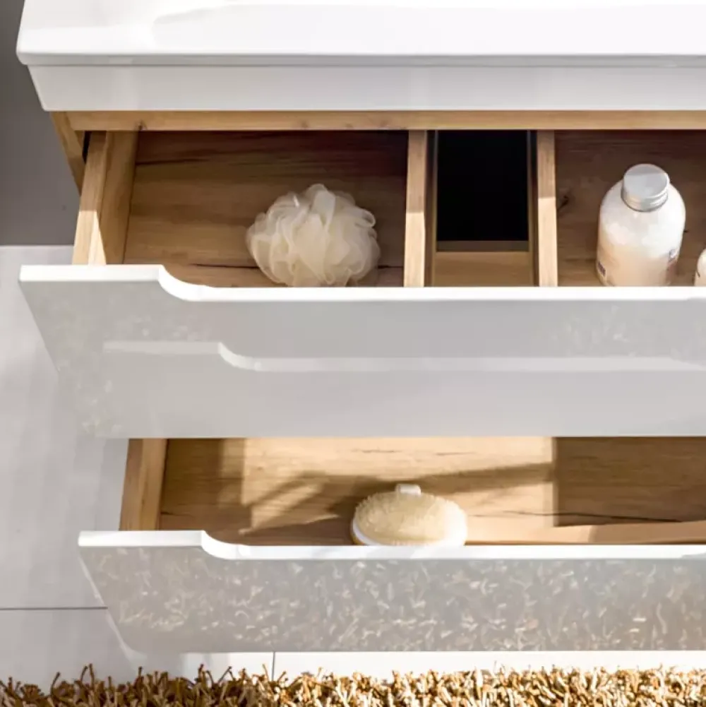 - Wisząca szafka pod umywalkę AURELIO o szerokości 80 cm została wyposażona we dwie szuflady umieszczone na prowadnicach wzbogaconych o bezgłośny system cichego domyku, w których znajdziesz miejsce na swoje akcesoria.