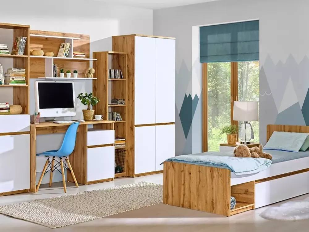 Nowoczesna szafa młodzieżowa to synonim jakości. Obrzeża szafy są zabezpieczone okleiną PCV, co gwarantuje jej trwałość i odporność na zniszczenia. Ta wytrzymała, odporna na zarysowania i pęknięcia okleina, jest łatwa do czyszczenia i utrzymania, co sprawia, że szafa będzie wyglądać jak nowa przez lata.