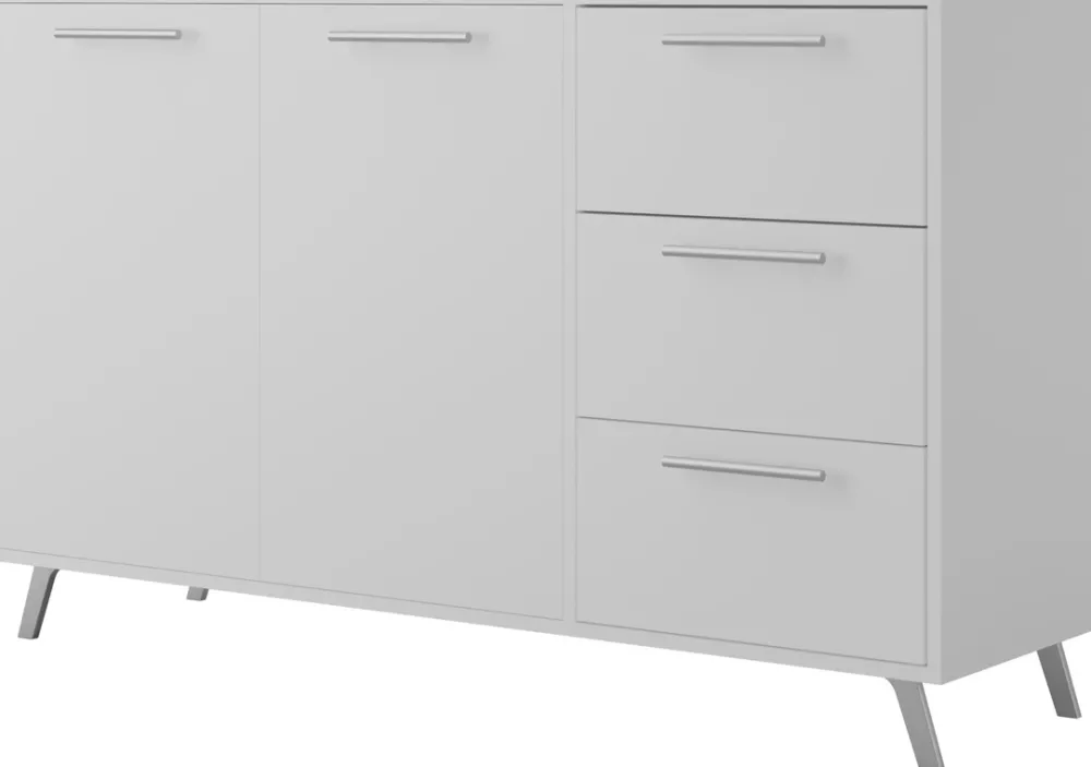- Komoda 140 cm BILL posiada parę drzwi oraz trzy pojemne szuflady osadzone na prowadnicach rolkowych. Komoda została wykonana z płyty laminowanej 16 mm, obrzeża estetycznie wykończono okleiną PCV. Za drzwiami znajduje się półka.