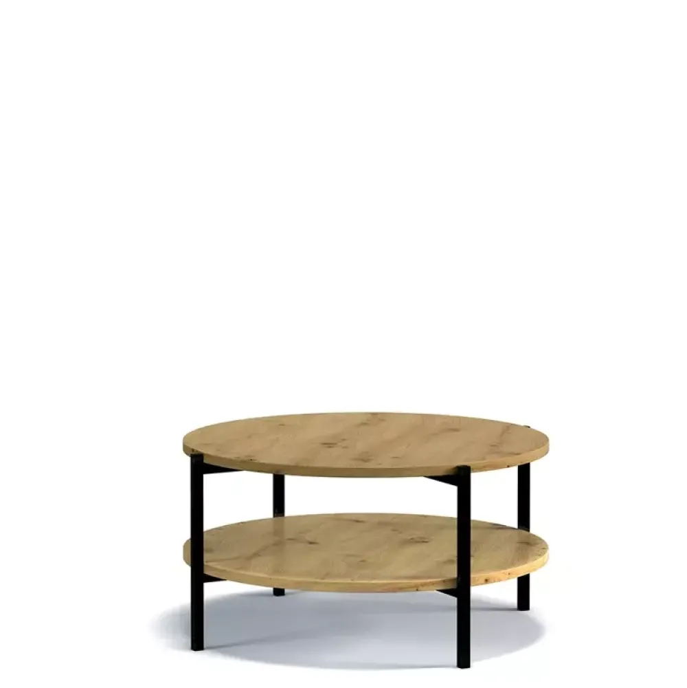 Okrągły stolik kawowy z kolekcji ETA ma blat i półkę pod nim w kolorze dąb artisan, wykonane z wysokiej jakości płyty laminowanej grubości 32 mm. Ława do salonu osadzona jest na czarnych metalowych nogach wykonanych z profilu o grubości 20 mm. Stolik jest lekki, więc bez problemu go przestawisz, dzięki czemu świetnie sprawdzi się w małym mieszkaniu. Stelaż delikatnie nachodzi na blat co prezentuje się ciekawie i nowocześnie.