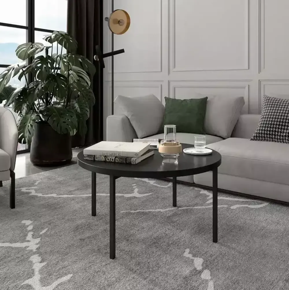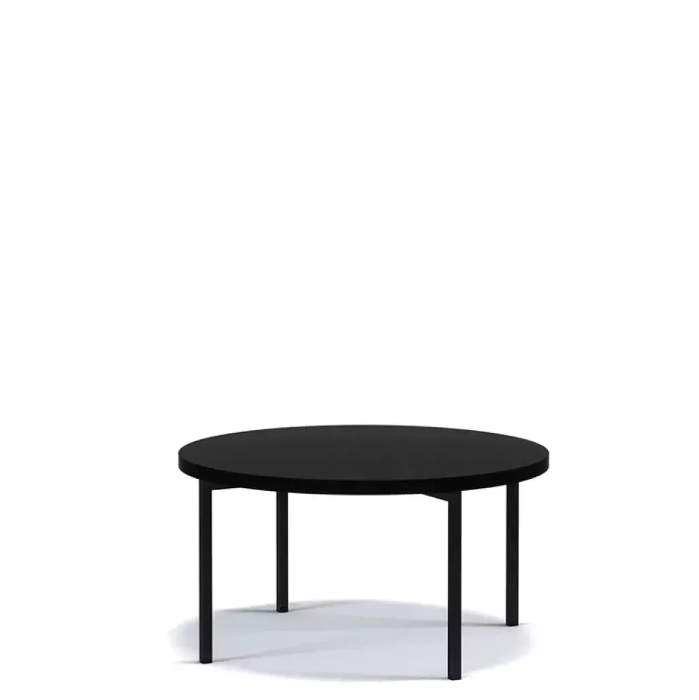 Okrągły stolik kawowy z kolekcji ETA ma blat w kolorze czarnym o wykończeniu matowym, wykonany z wysokiej jakości płyty laminowanej grubości 32 mm. Ława do salonu osadzona jest na czarnych metalowych nogach wykonanych z profilu o grubości 20 mm. Stolik jest lekki, więc bez problemu go przestawisz, dzięki czemu świetnie sprawdzi się w małym mieszkaniu. Blat w całości nachodzi na stelaż i go przykrywa.